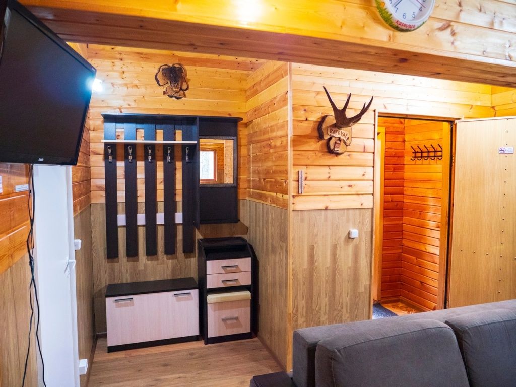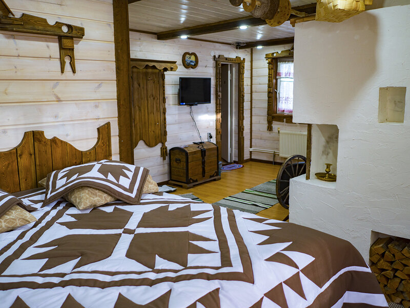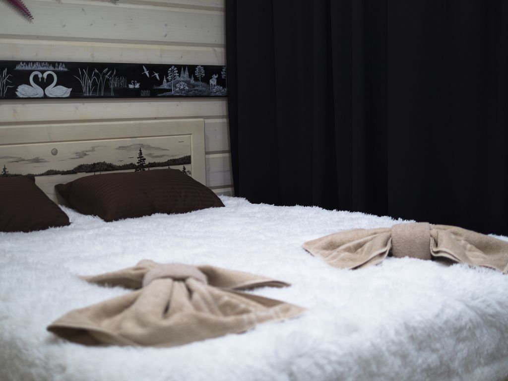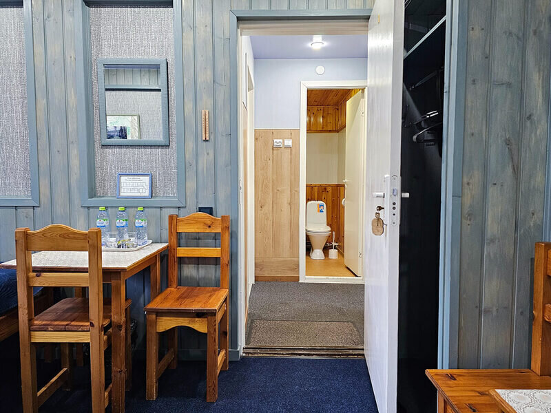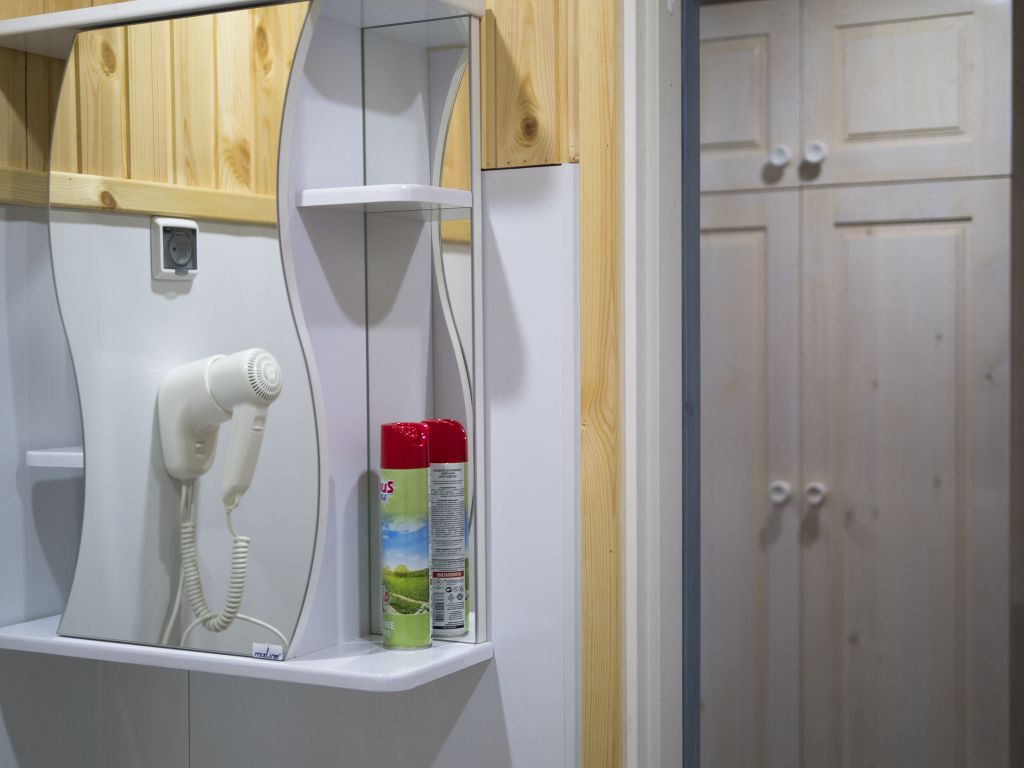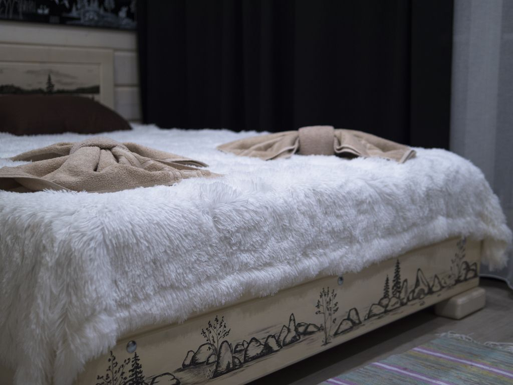 В номере: спальная мебель из массива карельской сосны (ручная работа), прикроватные тумбочки, вешалка для одежды, стол и стулья, ТВ, Wi-Fi, зеркало, графин, стаканы, покрытие пола ковролин. В летнее время выдается фумигатор.