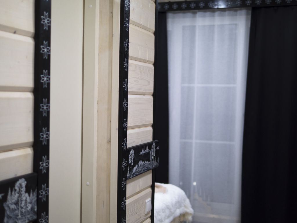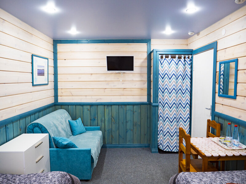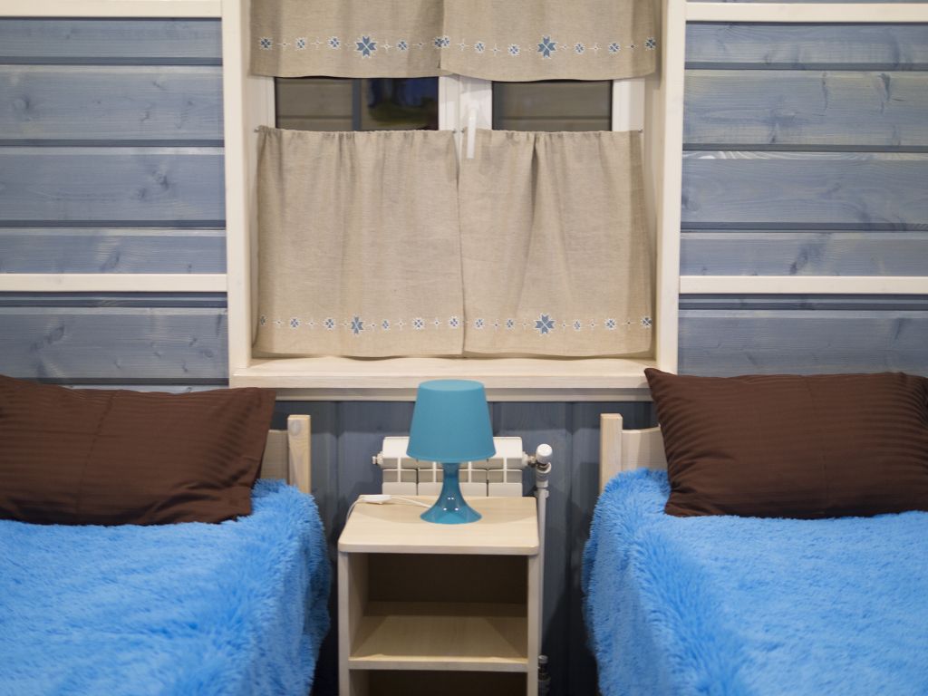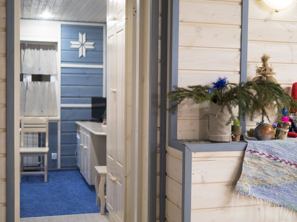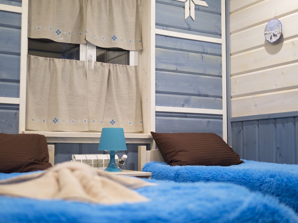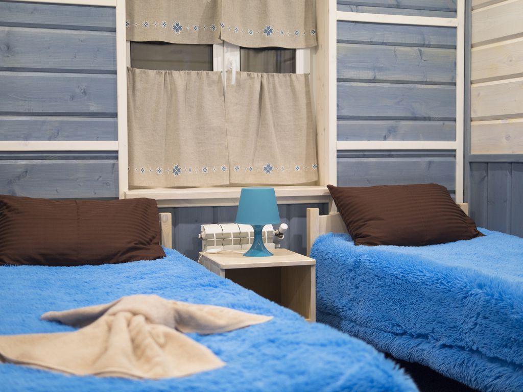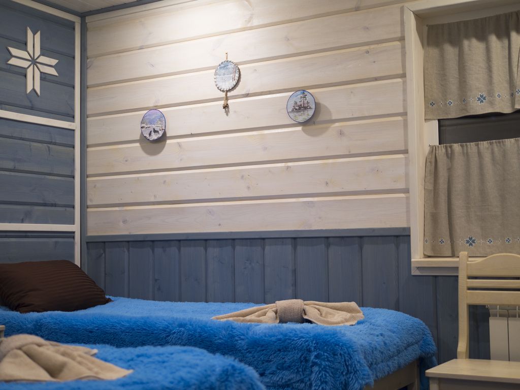 Отделка комнат: стены рау-хауз (имитация бруса) из карельской сосны, покрытие пола — ковролин, паровое отопление, окна — металлопласт. Шторы blackout отличная защита от света в пору «белых ночей». Летом выдается фумигатор (защита от комаров).