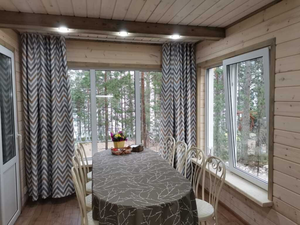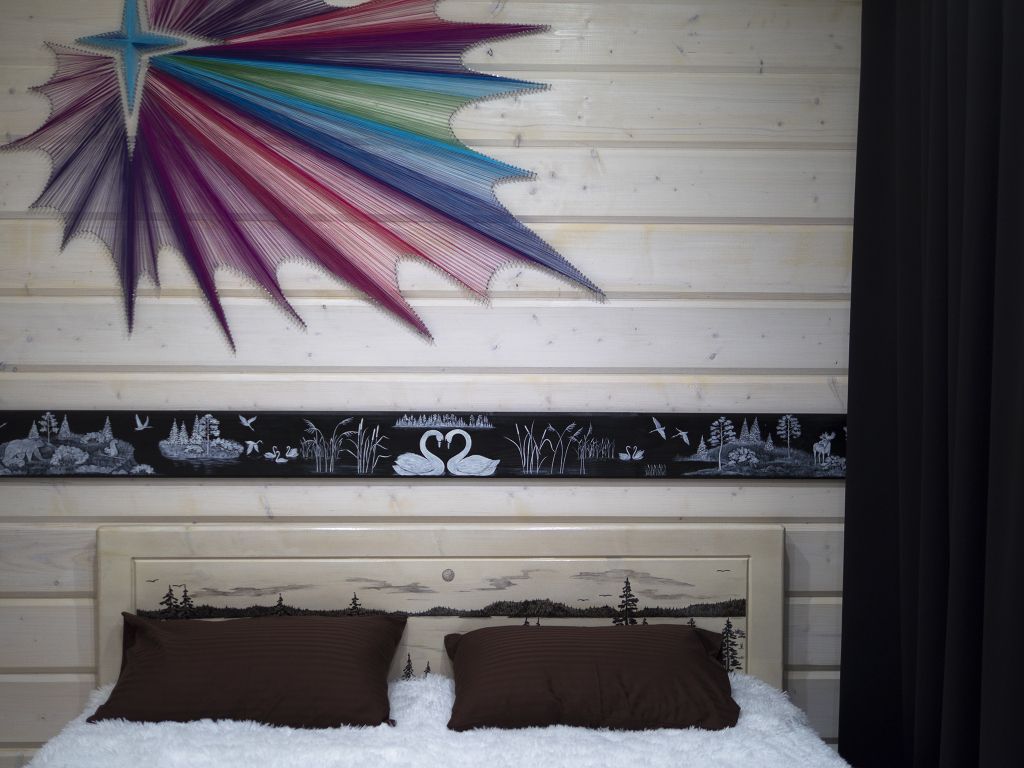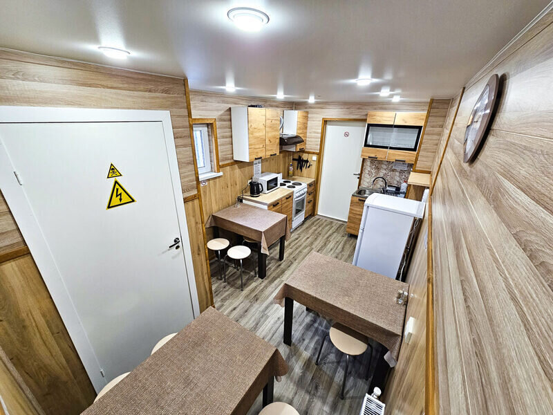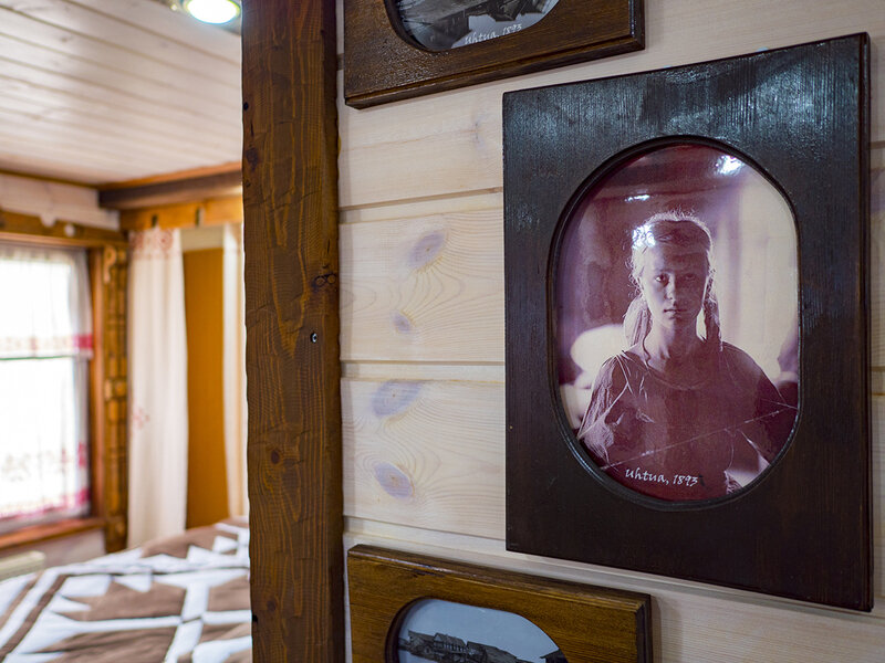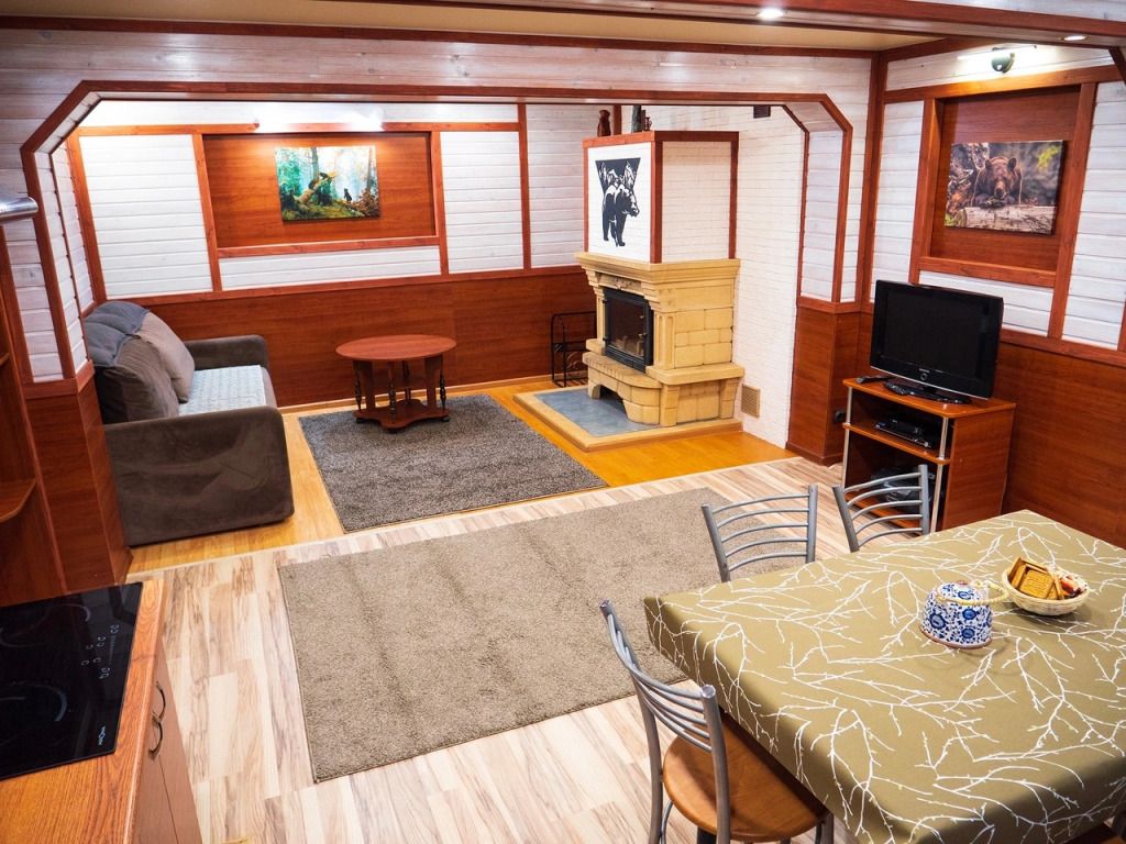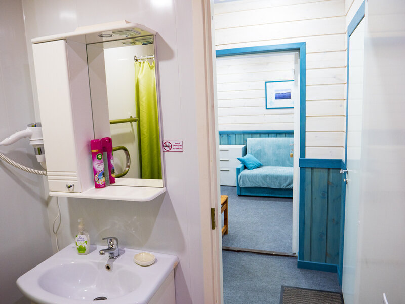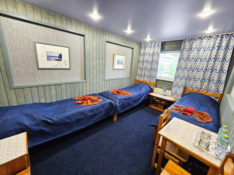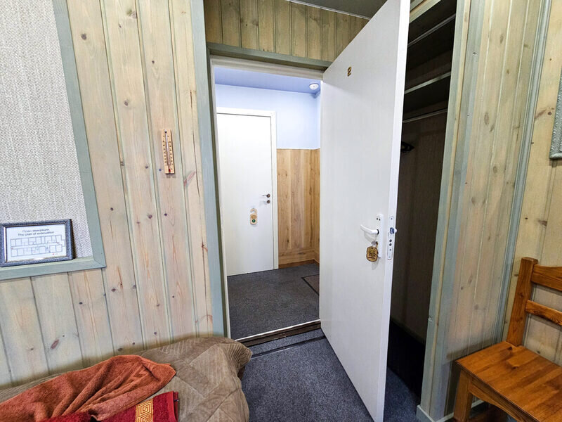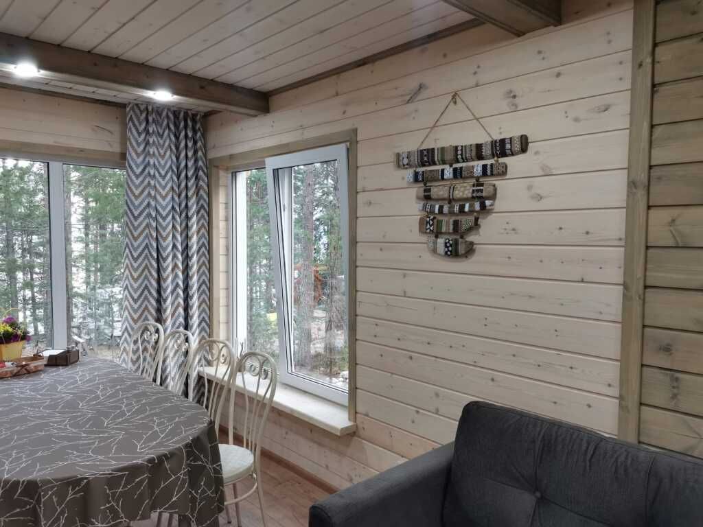Отделка комнат: стены рау-хауз (имитация бруса) из карельской сосны, покрытие пола — ковролин, паровое отопление, окна — металлопласт. Шторы blackout отличная защита от света в пору «белых ночей». Летом выдается фумигатор (защита от комаров).