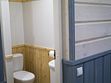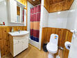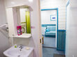 Душевая (одна на две комнаты): напольный кафель, душевая кабинка, унитаз, раковина, фен, шкафчик с зеркалом.