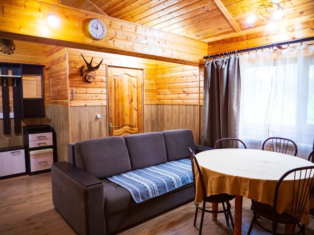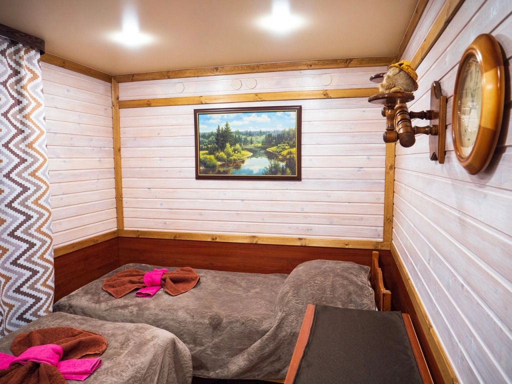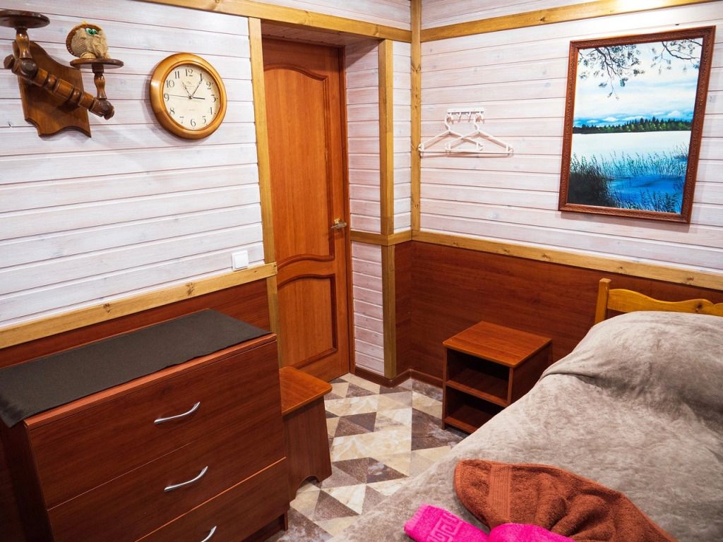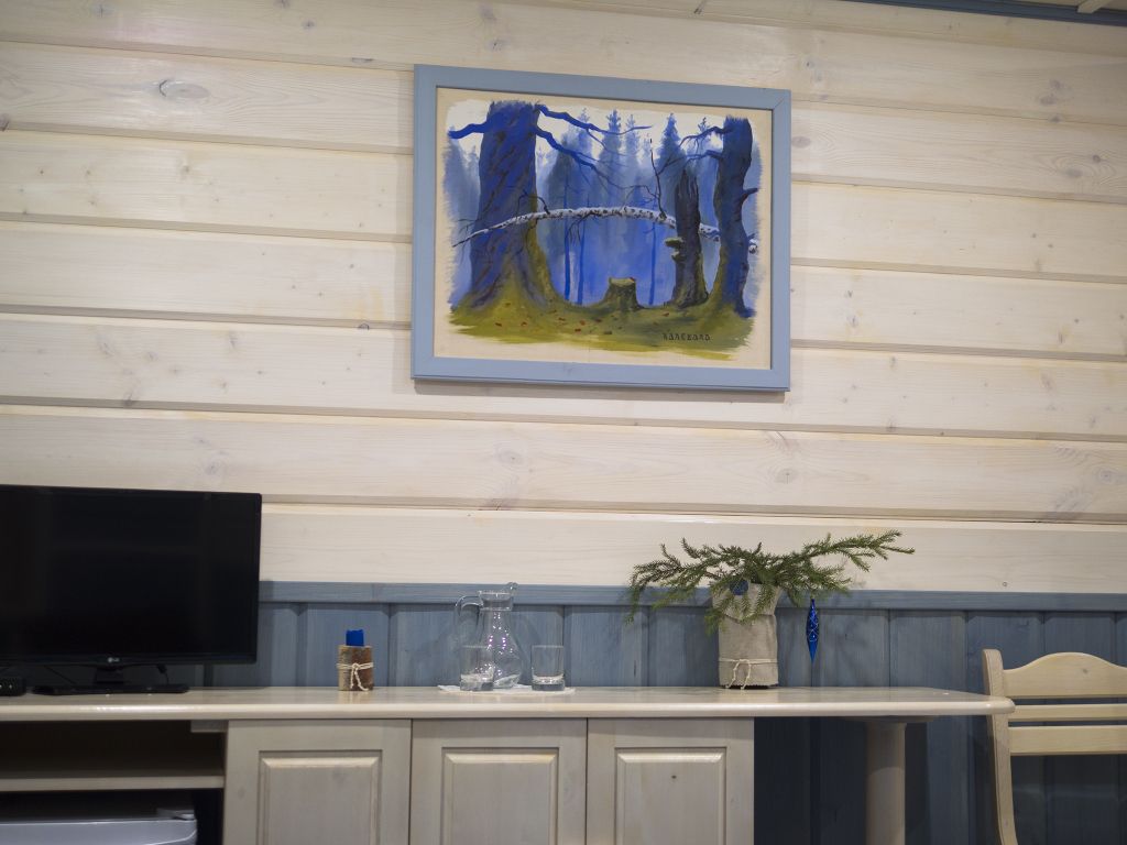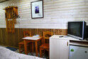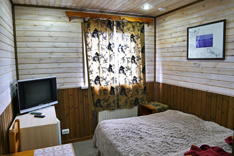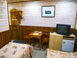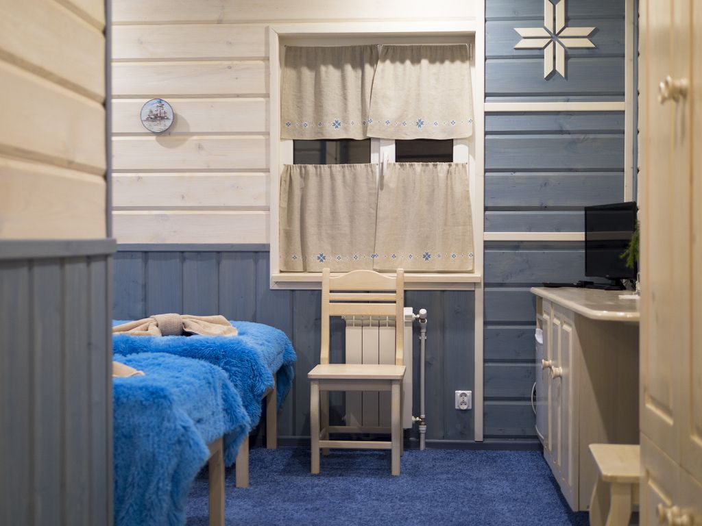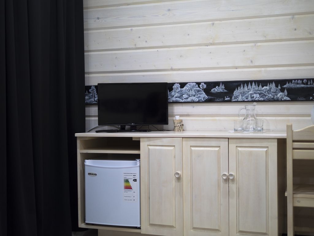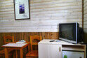 В номере: спальная мебель из массива карельской сосны (ручная работа), прикроватные тумбочки, вешалка для одежды, стол и стулья, ТВ, зеркало, графин, стаканы, покрытие пола ковролин. В летнее время выдается фумигатор.