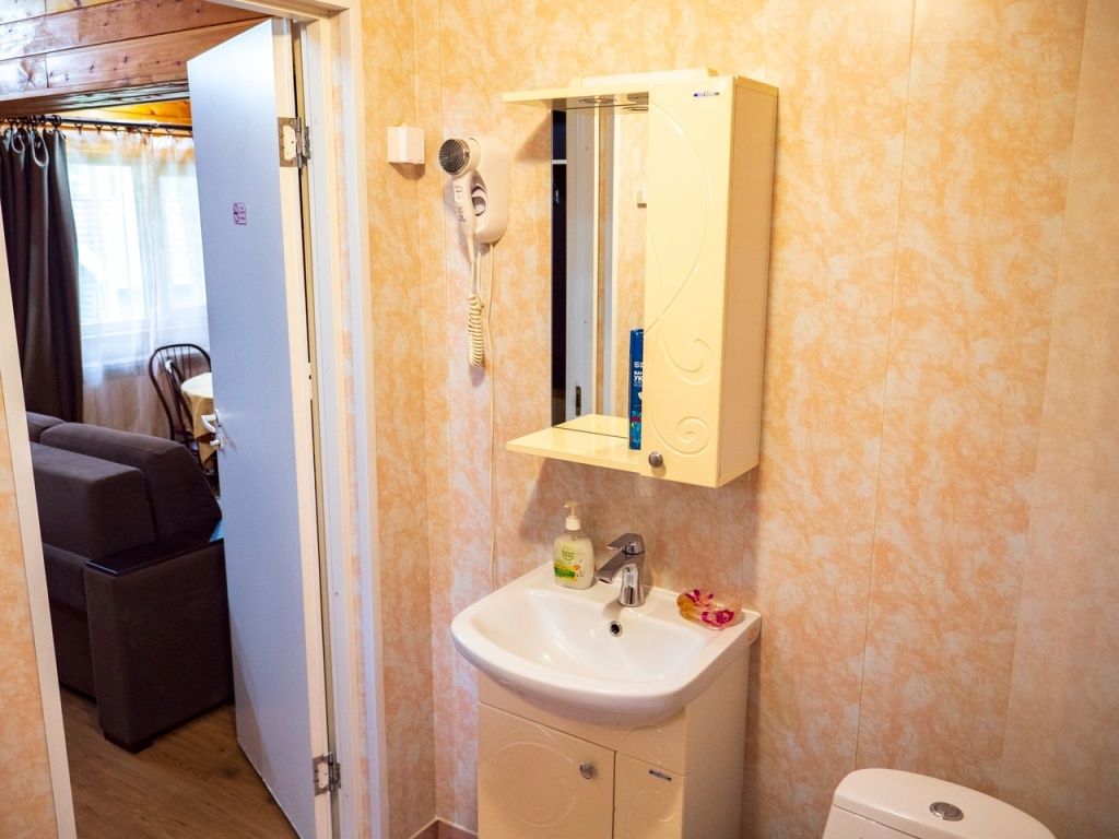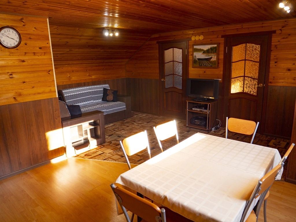 Итак, номер Карельская изба, позиционируется, как лучший, но во-первых он расположен за стеной от общественных душа и туалета и напротив кабинетов компании Велт те если вас не разбудит звук душа или туалета (примерно с 6 утра), то уж точно с 8 начнутся звонки ! К тому же номер расположен над кухней и кафе и вы будете первыми, кто узнает по запахам все меню на день, а часов с 8 выслушаете все новости тк телевизор весит аккурат под углом номера и включается громко …