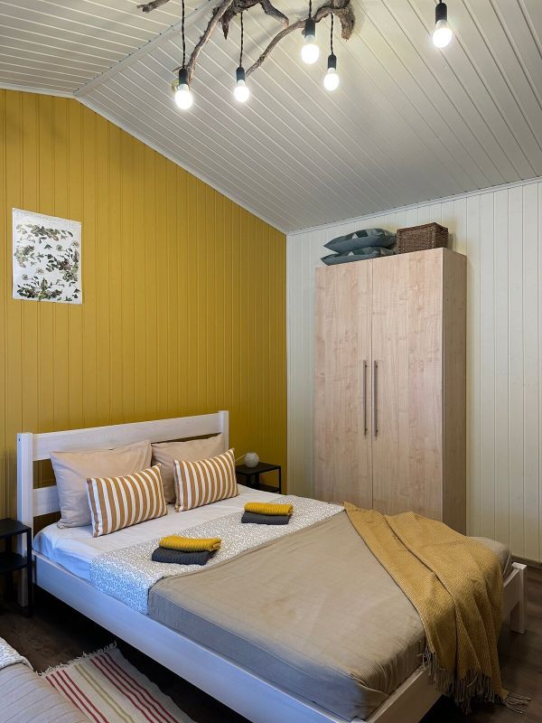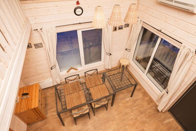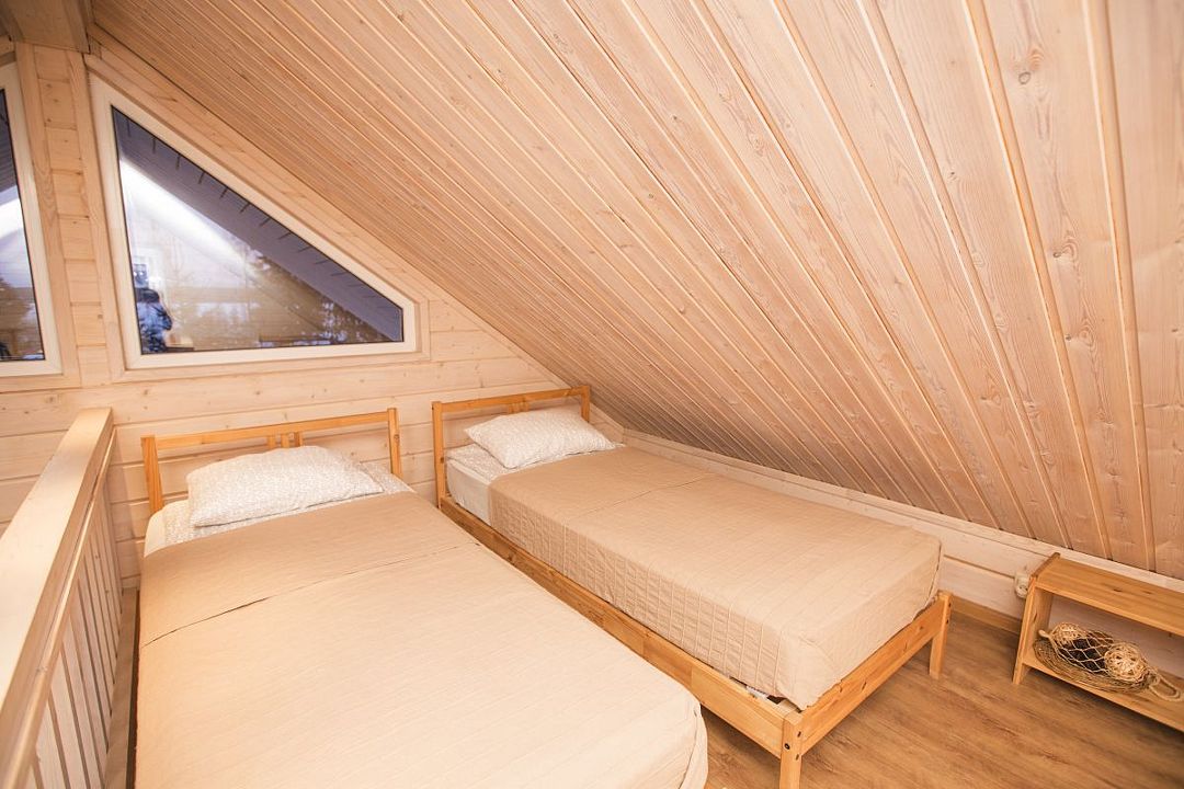 Дом оснащен всем необходимым: на первом этаже 2 отдельные спальни, в которых по 1 двуспальной кровати, гостиная зона с обеденным столом и телевизором, вешалки для одежды, ванная комната, полотенца. Есть кухонная зона с холодильником, варочной поверхностью, столовыми приборами. На втором этаже расположена открытая спальная зона с 4 полуторными кроватями.