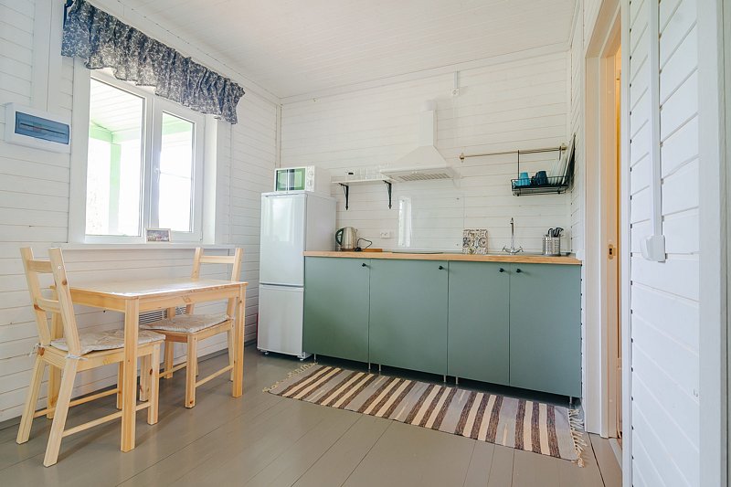 Для комфортного проживания каждый дом оснащен всем необходимым: полностью оборудованная кухня с чайником, микроволновой печью, плитой, холодильником, а также полным набором столовой посуды, посуды для приготовления пищи и приборов. Предусмотрены хозяйственные средства.