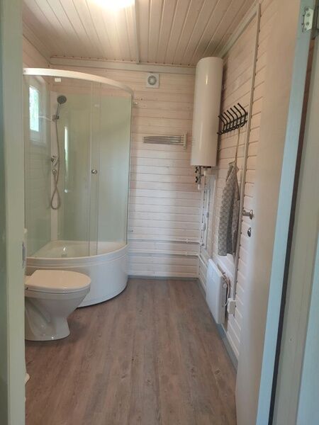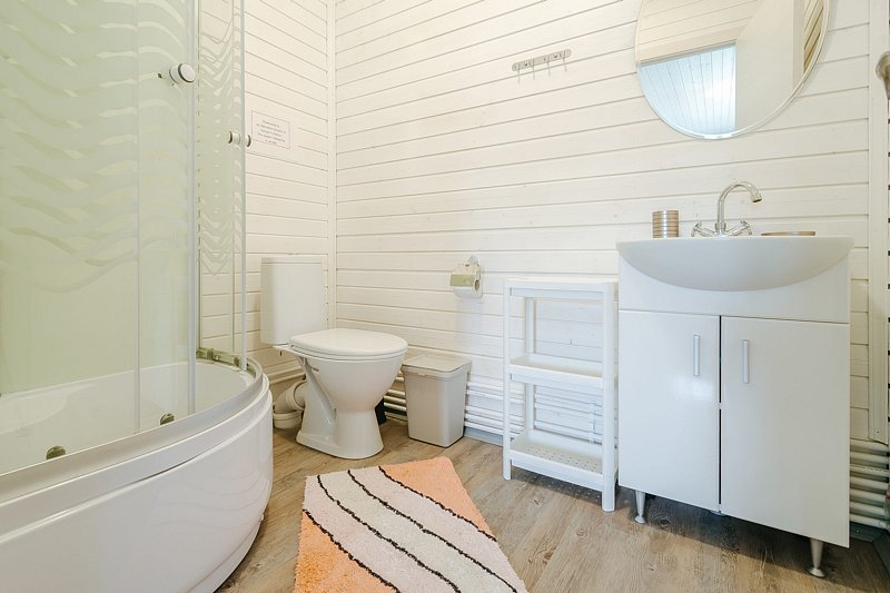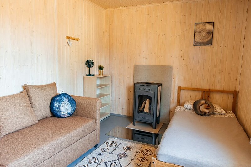 Дом рассчитан на 4 человека, 1 двуспальная кровать 140см, 1 кушетка-кровать 90-180см. В доме находится одна уютная спальня. Вам предоставляются подушки, одеяла, постельное белье, полотенца. Кухня-гостиная оснащена холодильником, варочной панелью, набором всей необходимой посудой. Санузел оборудован душевой кабиной, раковиной, унитазом, предоставляются туалетные принадлежности.