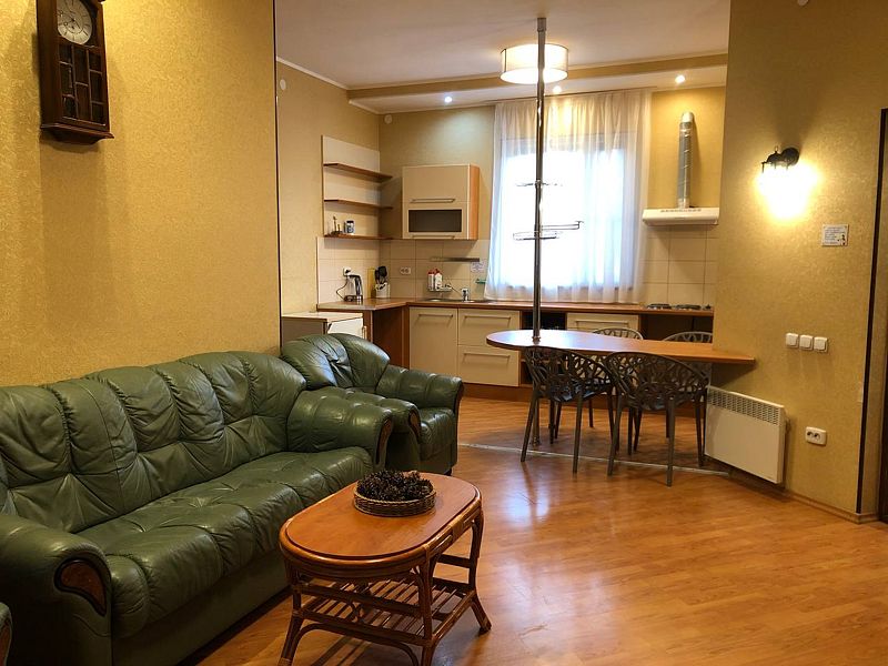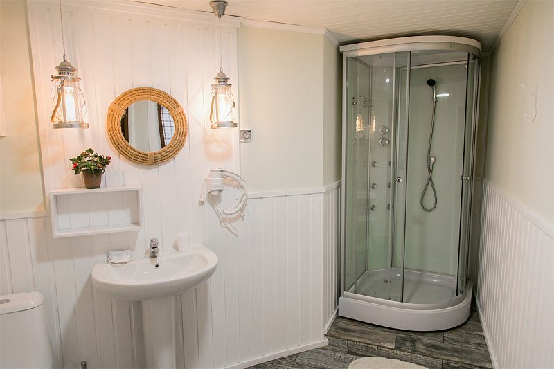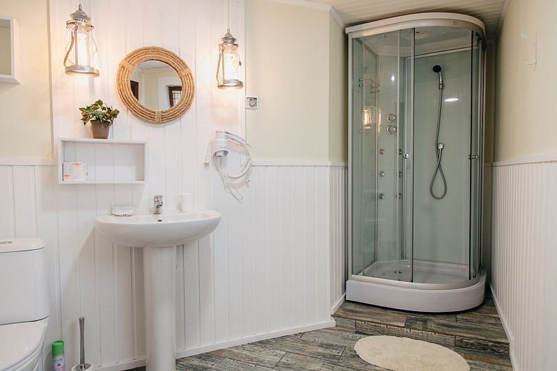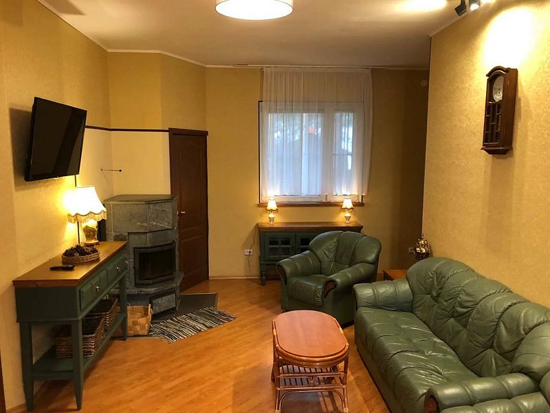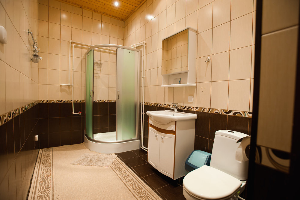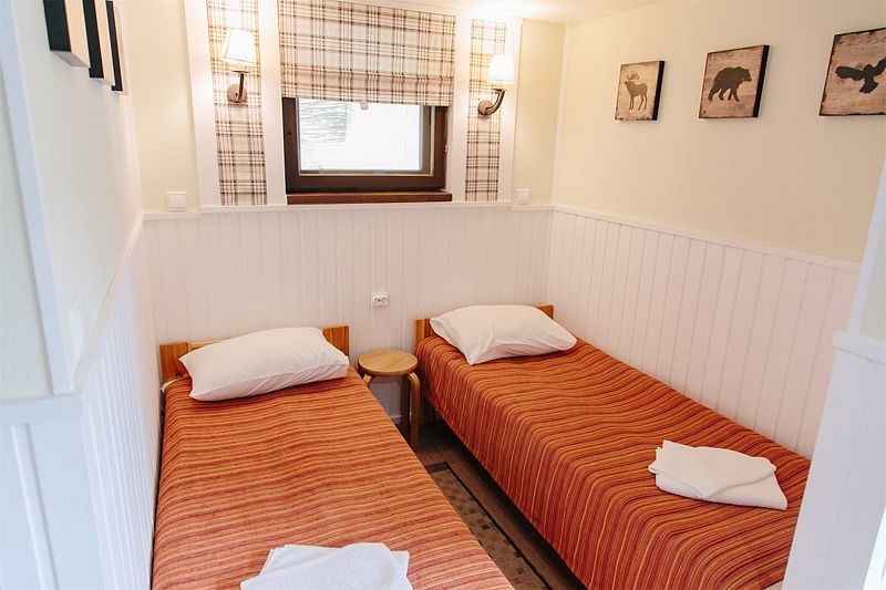 В номере три комнаты - каминный зал с кухней и две спальни, одна с двуспальной кроватью, вторая с двумя односпальными. Два туалета, душ. Телевизор, холодильник, кухня, электрочайник, электроплита, посудомоечная машина, СВЧ печь, набор посуды. Номер имеет отдельный вход с улицы.