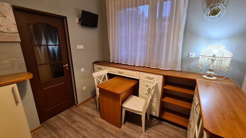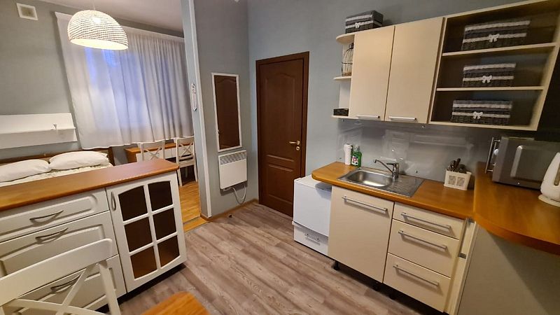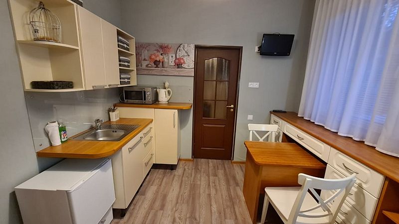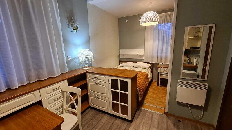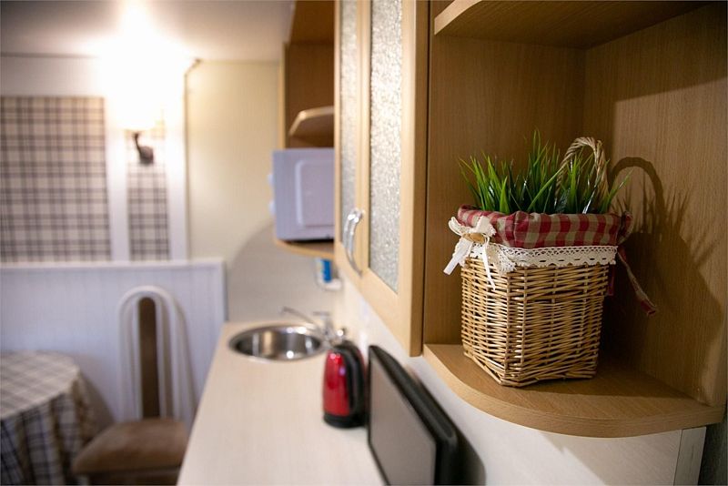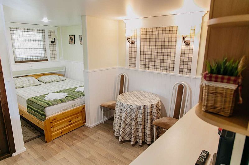 Телевизор, раздельный душ/туалет, фен, холодильник, мини-кухня, электрочайник, СВЧ печь, набор посуды, шкаф/гардероб, двуспальная кровать.