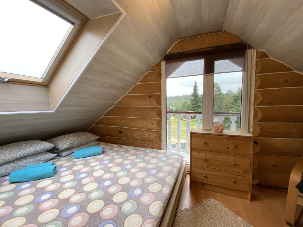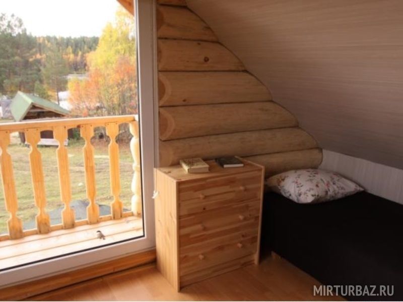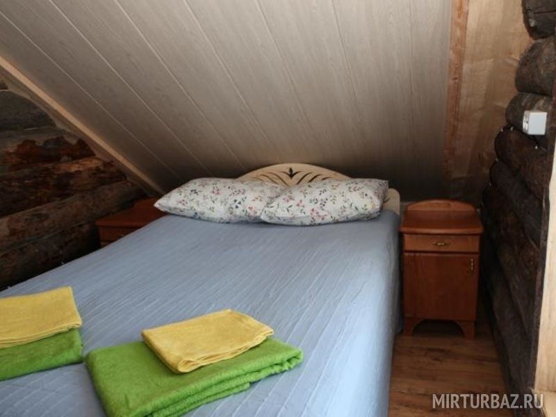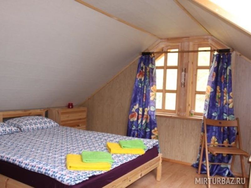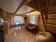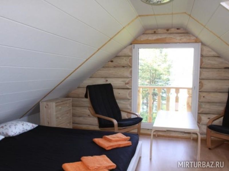 В коттедже есть гостиная с кухней, две спальни на втором этаже, веранда, душ, туалет, банька дровяная.