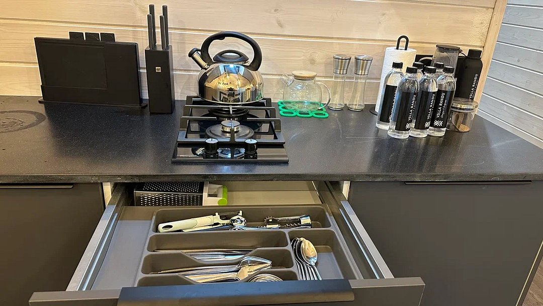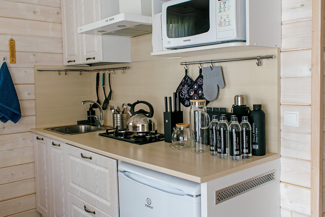 - Холодильник, микроволновка, чайник, а также столовые приборы и посуда,