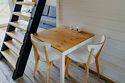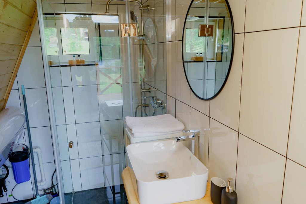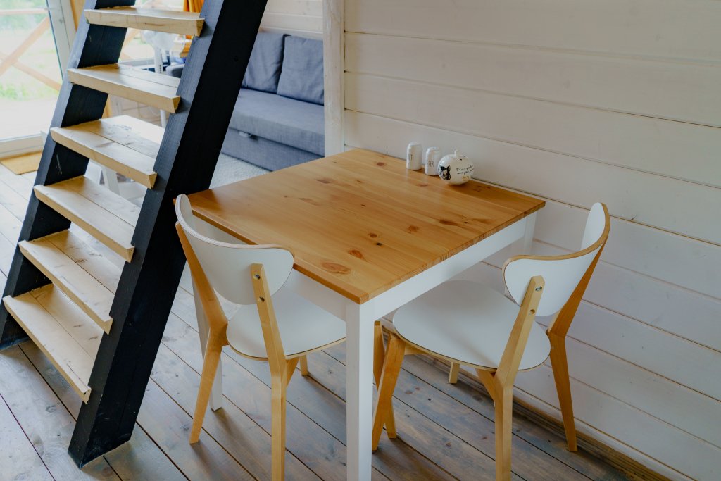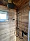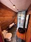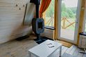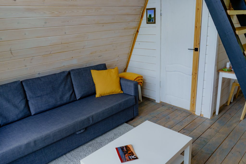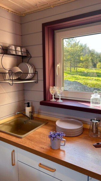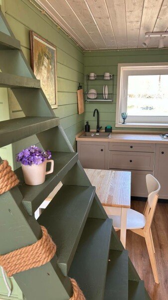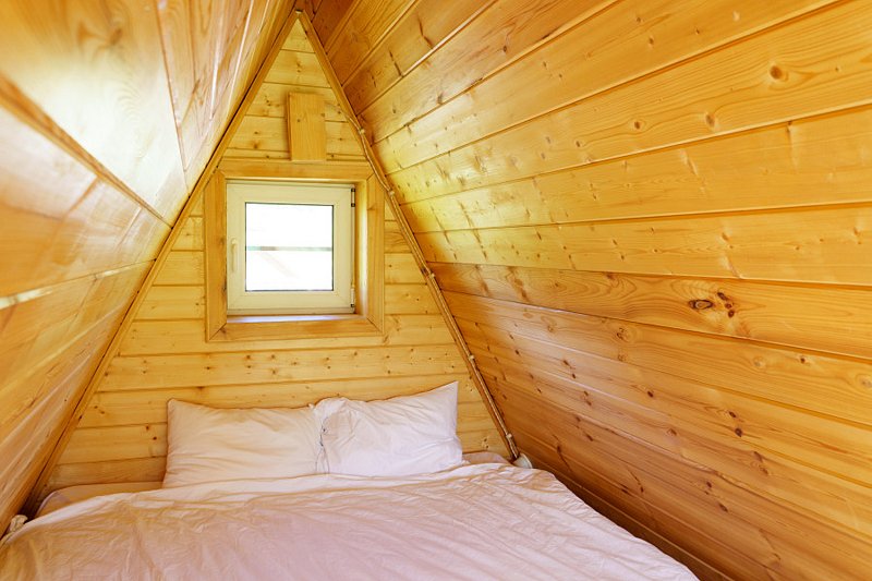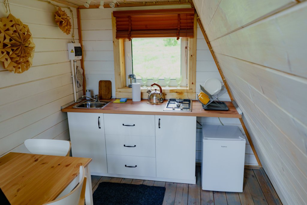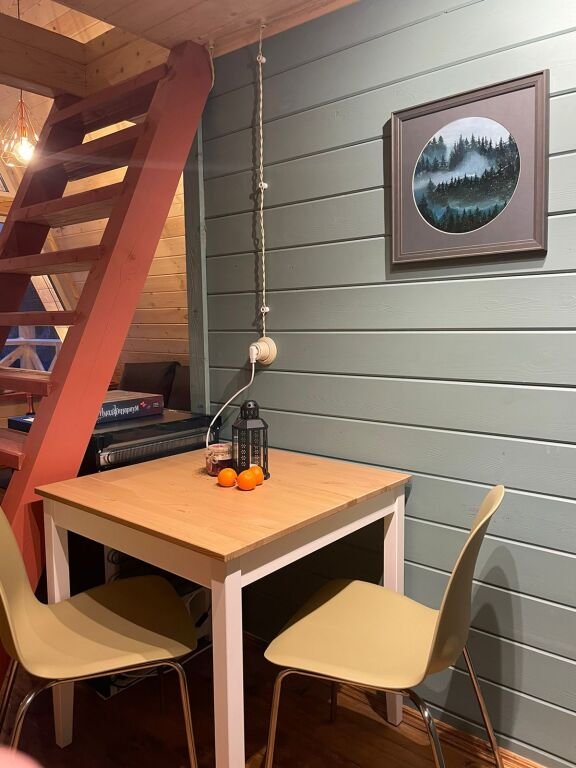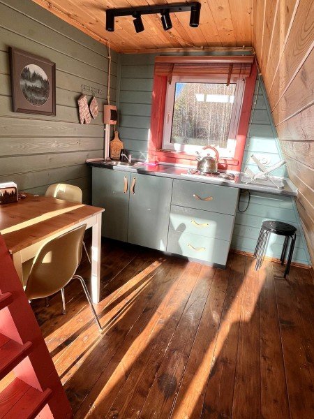 В доме — дровяной камин, душевая кабина и туалет, полноценная кухня со всем необходимым — газовая плита, посуда, холодильник. На первом этаже — раскладной диван, на втором — большое двухспальное место.
