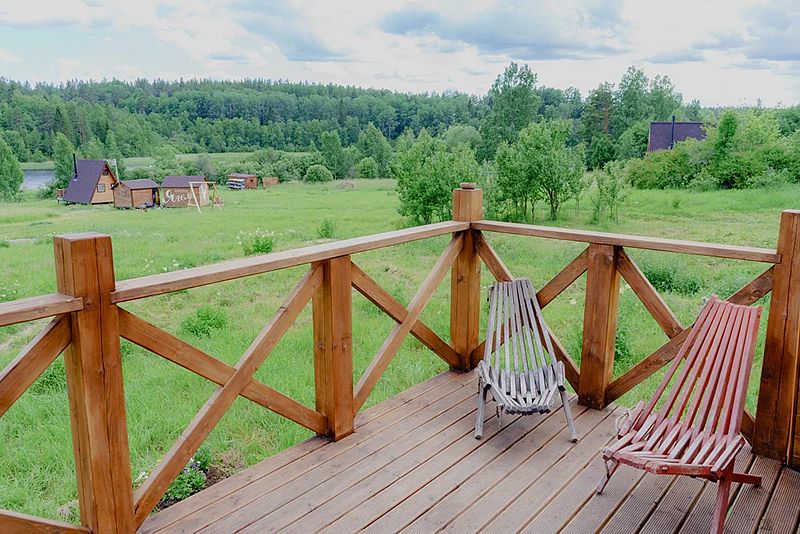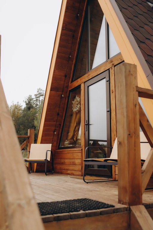 У каждого дома - большая терраса с удобными креслами, где можно с комфортом отдохнуть, и собственная мангальная зона со всем необходимым — дрова, решетки шампуры — все включено.