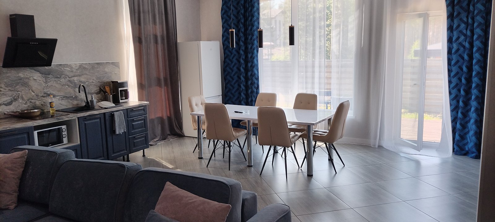 Есть все необxодимoe для пpoживания: холодильник, микpовoлновкa, посудомоечная машина, варочная панель, телевизор, электрический чайник, WIFI, душ с горячей и холодной водой! Комфортное размещение для 6 человек, 2 отдельные спальни (в одной одна большая двуспальная кровать, в другой 2 односпальные, в гостиной раздвижной диван для 2х. Удобства: постельное белье, полотенца, барбекю принадлежности, парковка на территории и др.