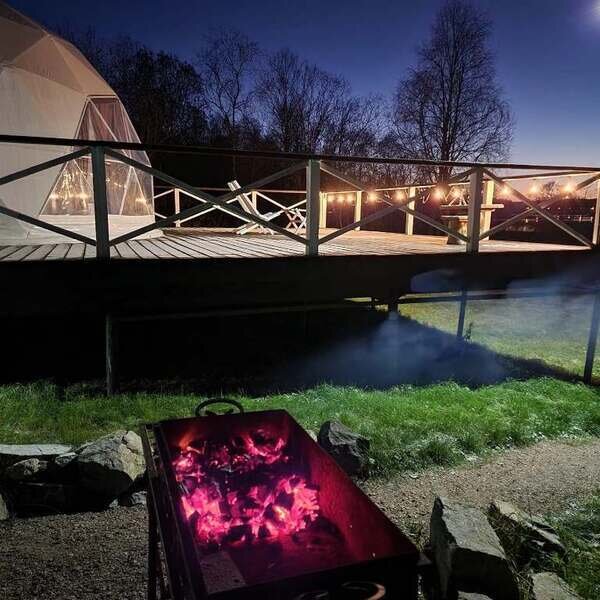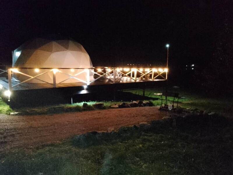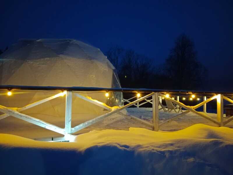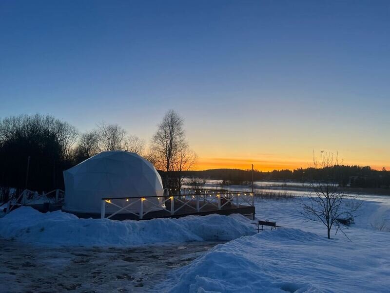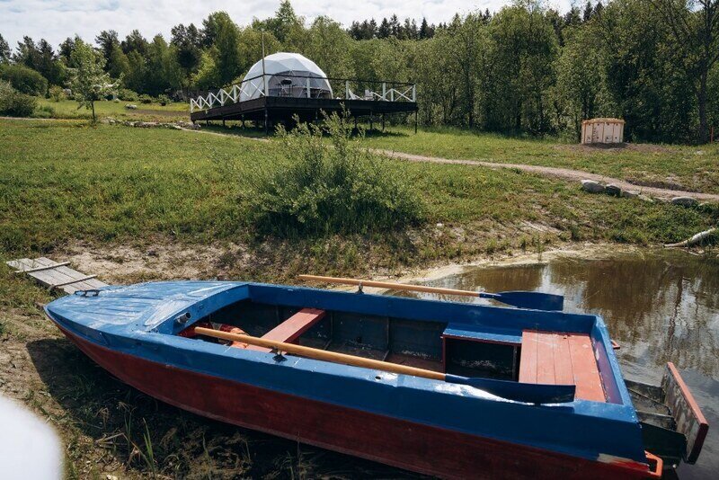 На территории с куполом оборудована терраса со столиками и стульями, зона барбекю с мангалом, баня и пирс, с которого можно порыбачить. Можно искупаться в озере и сходить в лес на прогулку.