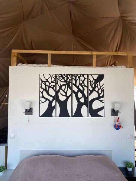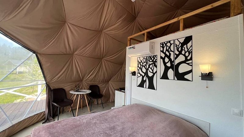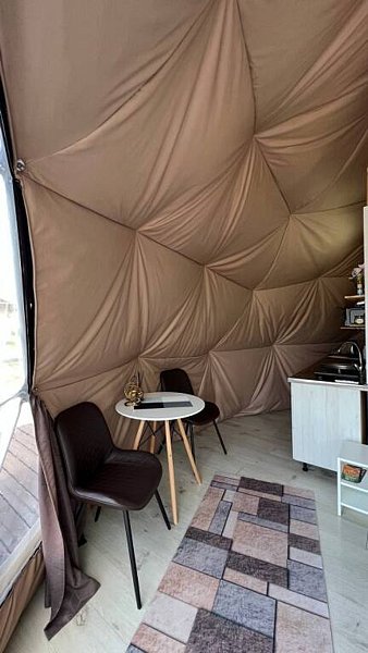 Для проживания доступен уютный геокупол вместимостью до 4 человек, оборудованный всеми удобствами: душевой зоной, кухней, техникой, кондиционером и удобной мебелью.