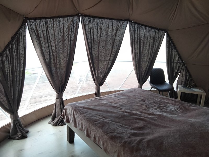 Кухня оборудована всем необходимым: варочная панель, микроволновая печь, чайник, холодильник с морозилкой, посудой, столовыми приборами. Предоставляется постельное белье, полотенца, фен. Теплый санузел (туалет, душ, раковина, бойлер), теплые полы, что позволяет размещать гостей в куполе круглый год.