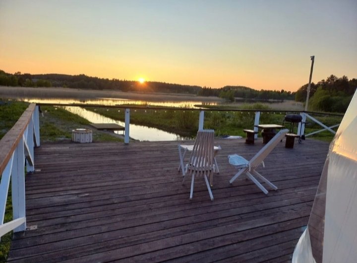Глэмпинг «Млечный путь» с баней и собственным пирсом расположен на самом берегу Ладожского озера.