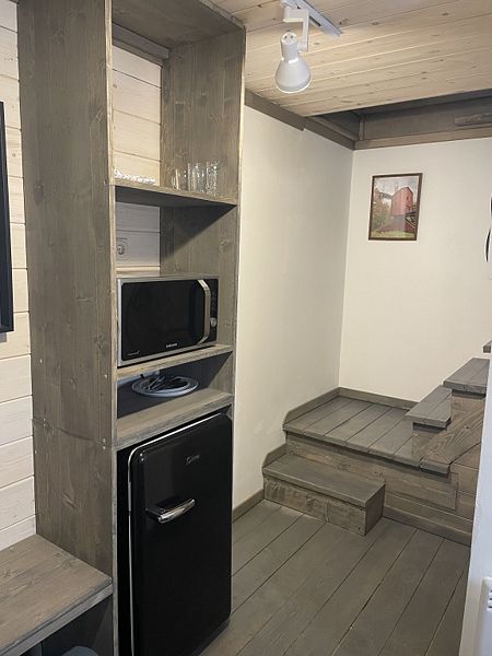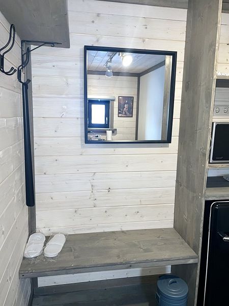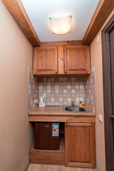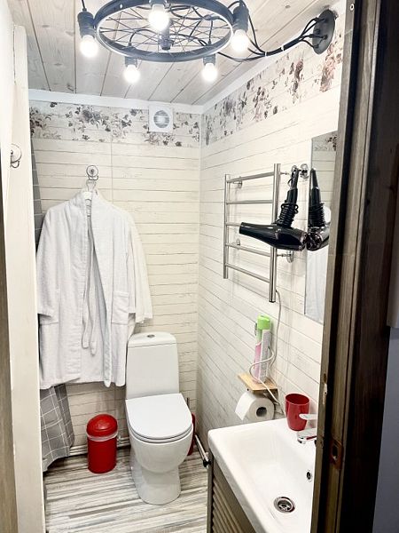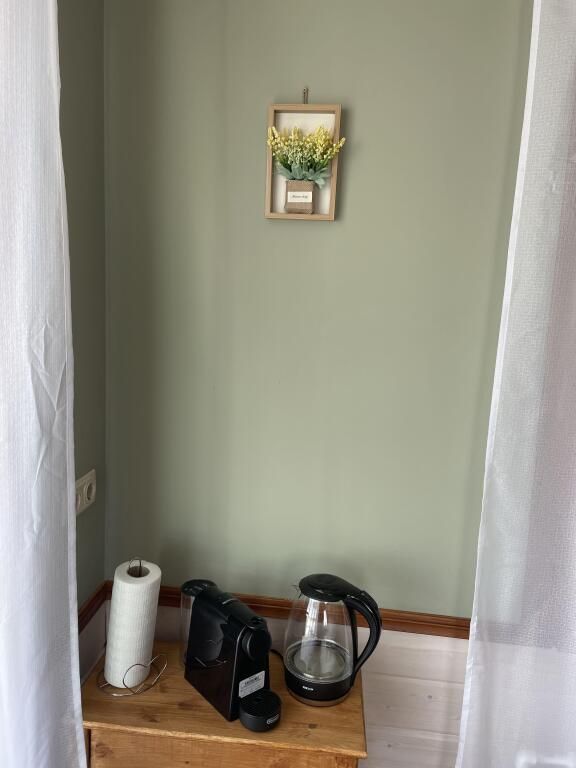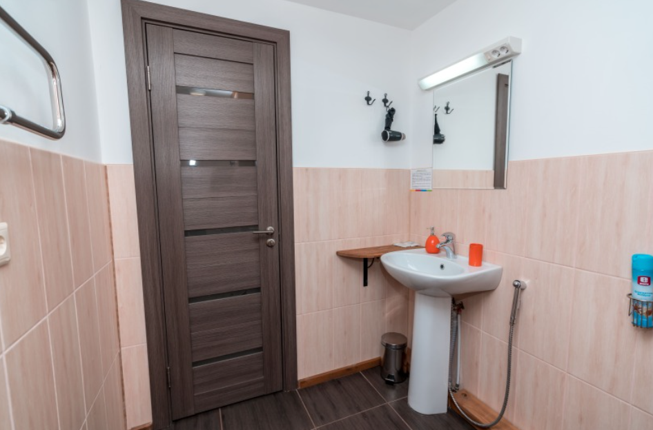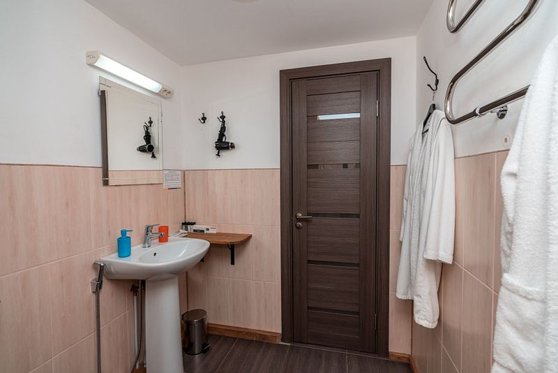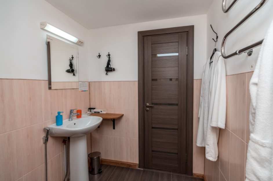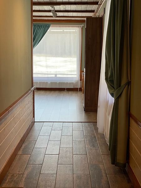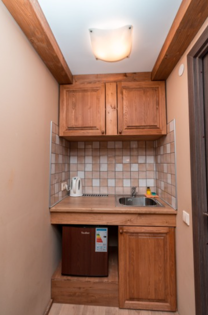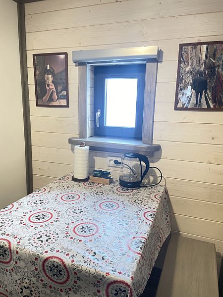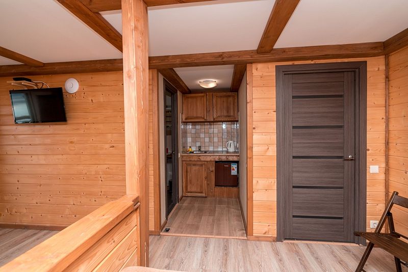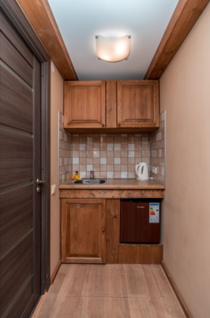 Номер такой же, как и на фото и в описании на сайте. Чисто, уютно, хорошее бельё, всё есть для жизни. Небольшая кухонька, правда без плиты, и тарелок я бы чуть добавила)) есть чайник, раковина. По бутылочке воды на каждого (приятно).