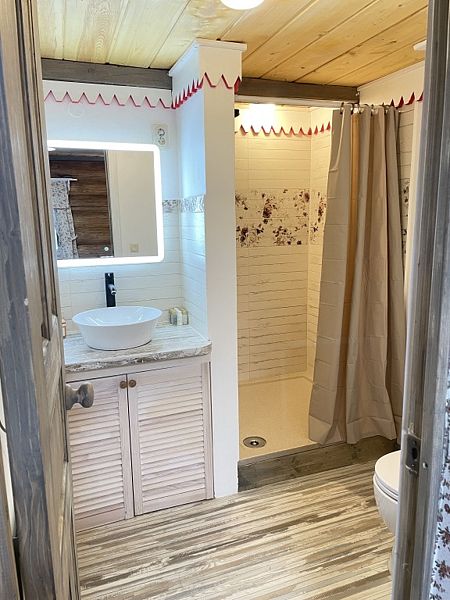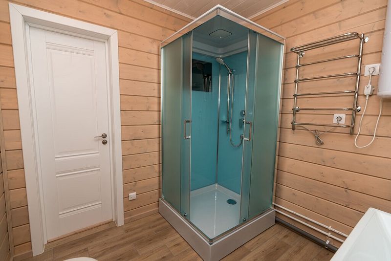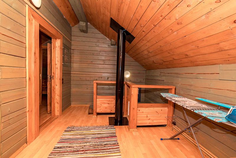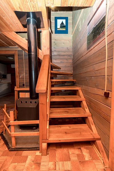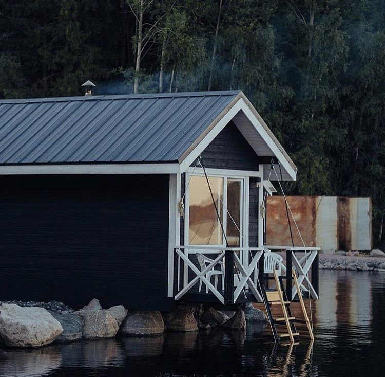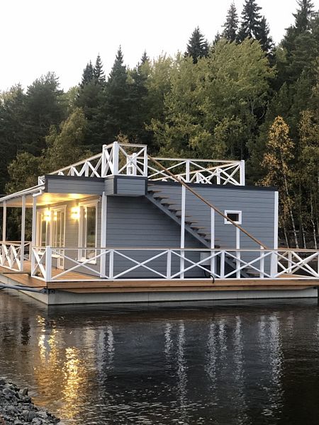 Баня стоит на земле, но имеет выход к воде, балкончик, куда можно выйти, расслабиться, искупаться и просто насладиться красотами.