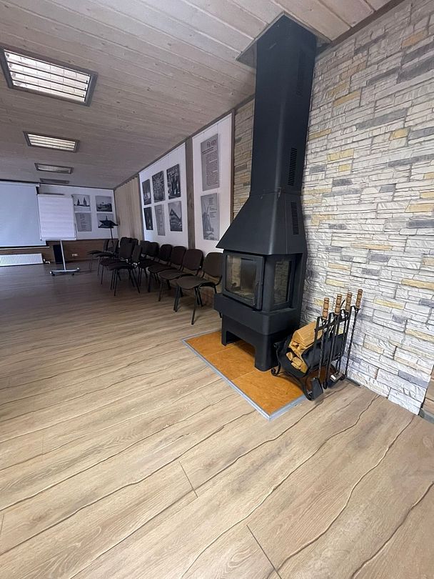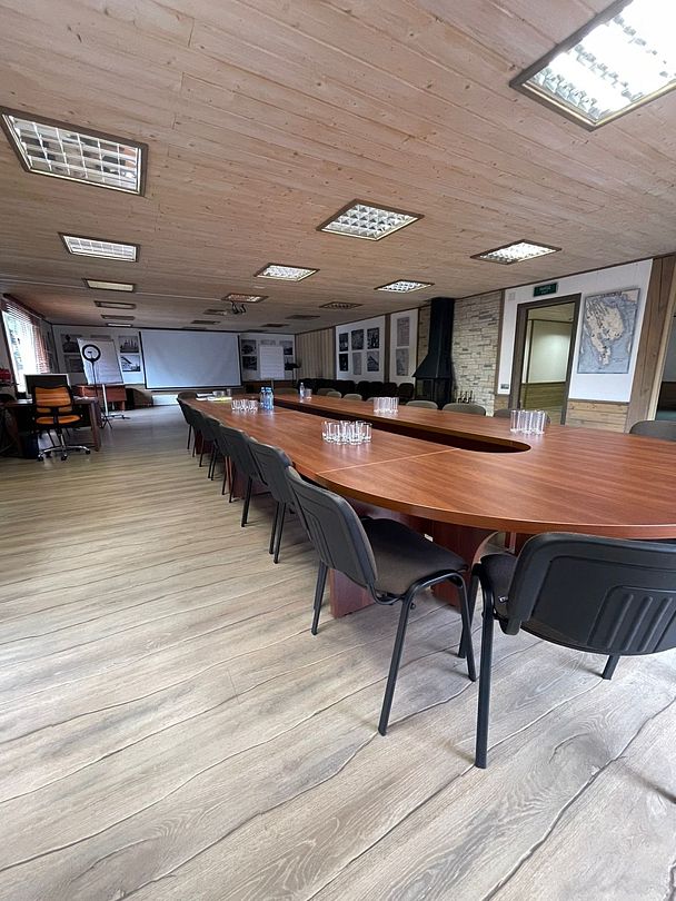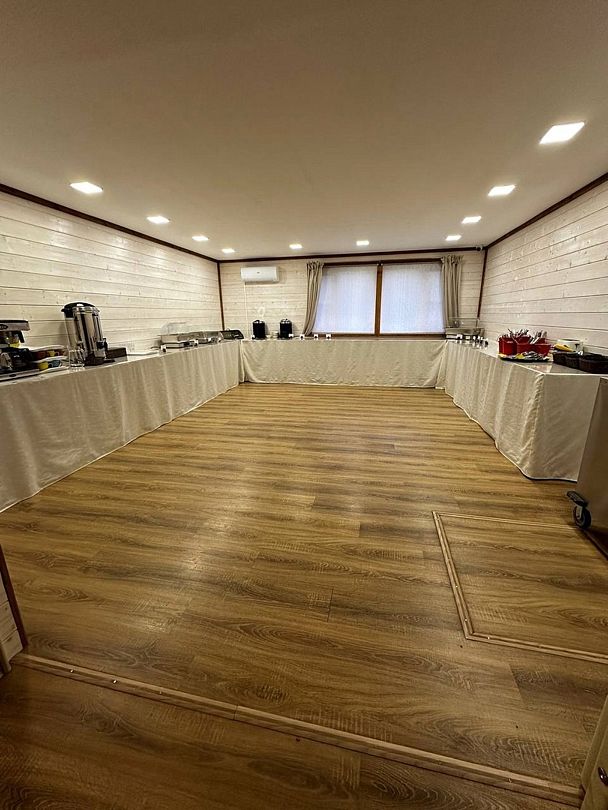 Просторный конференц-зал с видом на Ладожское озеро. Вместимость до 50 человек с рассадкой, кинозал с аппаратурой (проектор, микрофон).