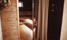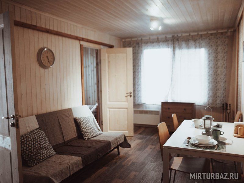 Домик финского типа с камином и баней на компанию/семью из 4 человек (2 спальни по 2 кровати, диван в гостиной, возможность 1 дополнительного места). На улице - зона барбекю.