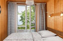 Спальня: белье, двуспальная кровать, тумбочки, панорамные окна на Онежское озеро, светильники, розетки.