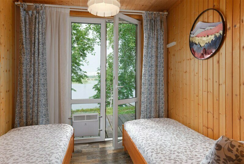 Спальня 2: две односпальные кровати каждая 90*200 см, белье, тумбочки, панорамные окна на Онежское озеро, светильники, розетки.