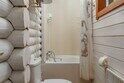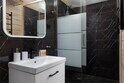 Ванная комната: душевая кабина, раковина с зеркалом, туалет, фен, туалетная бумага, полотенца, бойлер, полотенцесушитель.