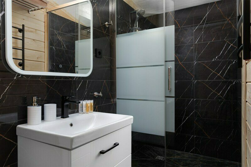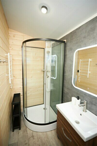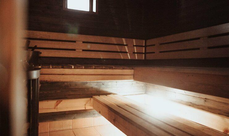 Компания (до 5 человек). Парная финского типа. Электрическая. Максимальная температура 100°C. Душевая с горячей и холодной водой. Комната отдыха. Диван, читальный столик, настенные вешалки, зеркало, розетки.