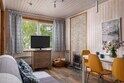 Тип планировки - отдельные комнаты и гостиная, вход в баню через гостиную. Полноценный санузел, миникухня (без плиты), холодильник, чайник, телевизор, микроволновка и раковина, гардеробная, посуда, постельные принадлежности.