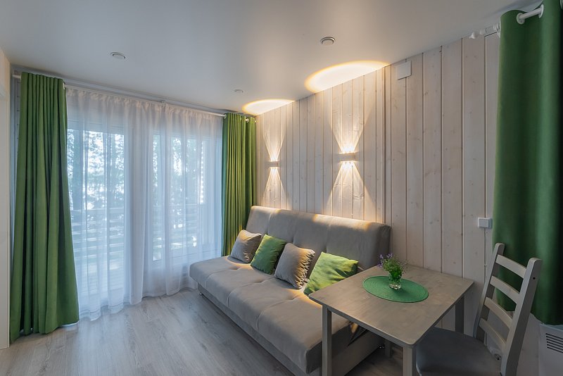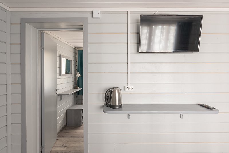 Комплектация: две односпальные кровати или одна двуспальная кровать (по заявке), двуспальный диван, тумба, стол, стулья, холодильник, электрический чайник, телевизор, стеллаж.