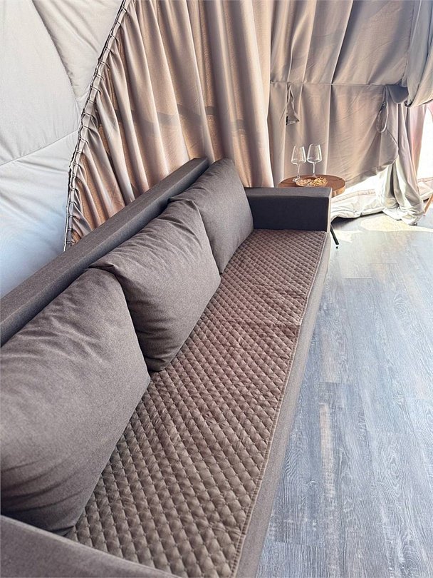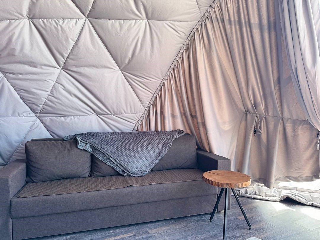 Представьте себе уединенный купольный домик, словно сошедший со страниц сказки, где современный комфорт гармонично переплетается с первозданной красотой природы. Внутри вас ждет уютная, но функциональная кухня, оборудованная всем необходимым для приготовления вкусных блюд: от компактного холодильника и микроволновой печи до чайника и полного набора кухонной посуды. Центральное место занимает удобная двуспальная кровать, обещающая безмятежный сон, а для путешествующих с детьми или друзьями предусмотрена дополнительная односпальная кровать, и двухспальный раскладной диван. Обеденная зона представлена столом со стульями, где можно насладиться едой или просто выпить чашку кофе, любуясь открывающимся видом. Современная душевая и туалет обеспечивают максимальный комфорт. Но главное сокровище этого домика – панорамный вид на величественное Ладожское озеро, простирающееся до самого горизонта. А на террасе, обставленной удобной мебелью для отдыха, вы сможете в полной мере насладиться свежим воздухом и умиротворяющей атмосферой, наблюдая за игрой солнечных лучей на водной глади.Услуги и удобства