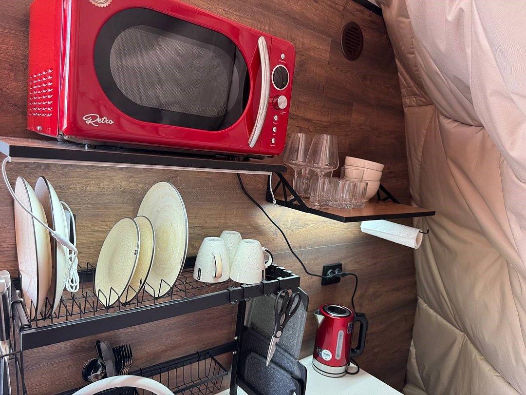 Представьте себе уединенный купольный домик, словно сошедший со страниц сказки, где современный комфорт гармонично переплетается с первозданной красотой природы. Внутри вас ждет уютная, но функциональная кухня, оборудованная всем необходимым для приготовления вкусных блюд: от компактного холодильника и микроволновой печи до чайника и полного набора кухонной посуды. Центральное место занимает удобная двуспальная кровать, обещающая безмятежный сон, а для путешествующих с детьми или друзьями предусмотрена дополнительная односпальная кровать. Обеденная зона представлена столом со стульями, где можно насладиться едой или просто выпить чашку кофе, любуясь открывающимся видом. Современная душевая и туалет обеспечивают максимальный комфорт. Но главное сокровище этого домика – панорамный вид на величественное Ладожское озеро, простирающееся до самого горизонта. А на террасе, обставленной удобной мебелью для отдыха, вы сможете в полной мере насладиться свежим воздухом и умиротворяющей атмосферой, наблюдая за игрой солнечных лучей на водной глади.Услуги и удобства