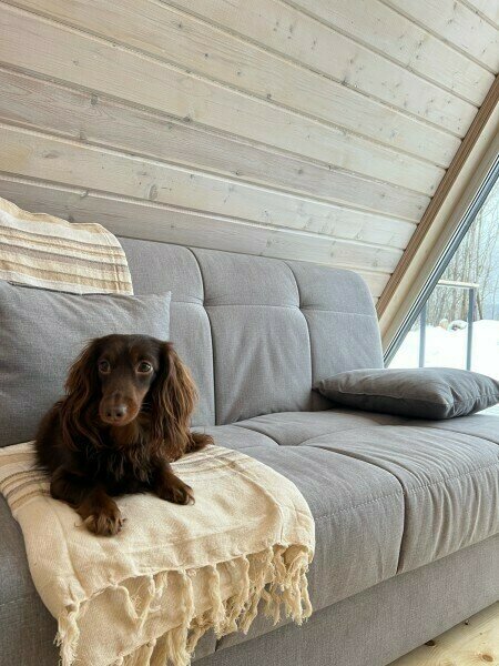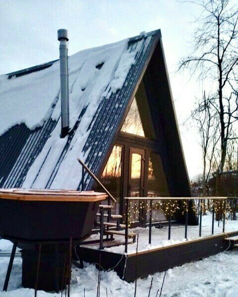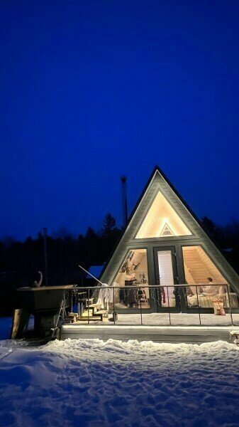 "A- frame" с Банным Чаном, это уютный дом с панорамными окнами, террасой, мангальной зоной и видом на Пертозеро. Внутреннее пространство организованно как студия – гостиная с камином, кухня , столовая зона с шикарным видом , спальня находится на втором этаже.. Максимальная вместимость дома – 4 человека.