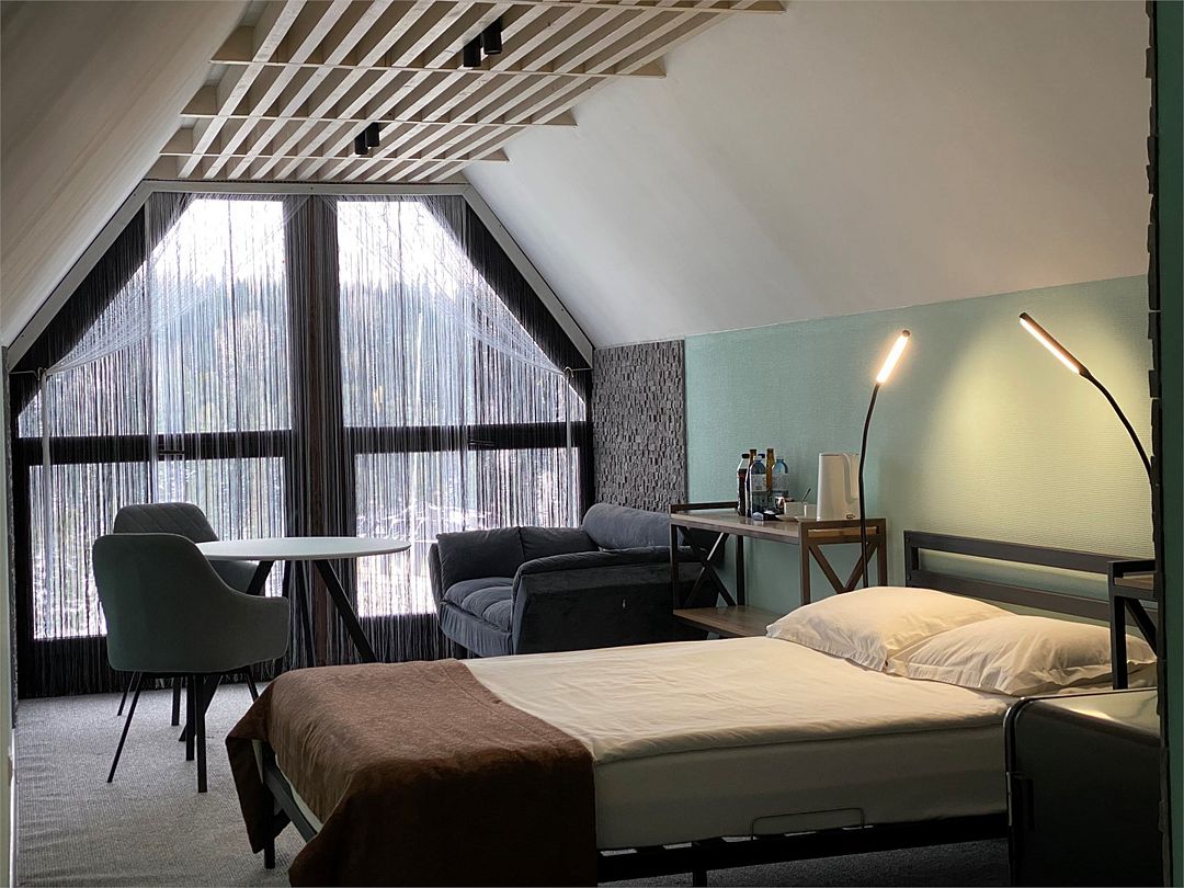кабельное телевидение, Wi-Fi, светильник, фен, душевая кабина, санузел, теплый пол, халаты, банные полотенца, тапочки, косметические средства, двуспальная кровать, диван, стулья, гардеробная, вешалки, чайный набор, чайник, унитаз, раковина, ковровое покрытие, кулер на этаже, стол, панорамные окна, телевизор с плоским экраном, вид на горы, теплые полы, номер для некурящих, пуфик, онлайн-регистрация до заезда, межкомнатная дверь, уборка номера, бутилированная вода, мылоВ гостиничном номере
