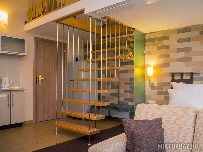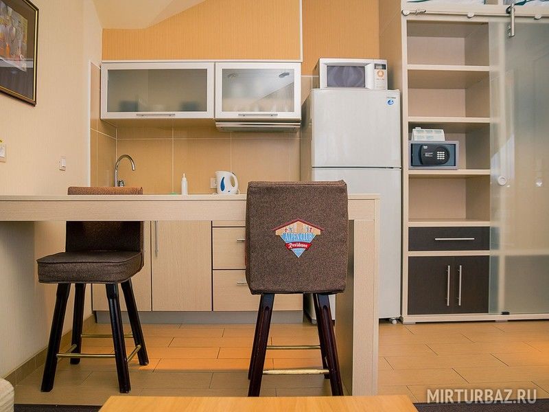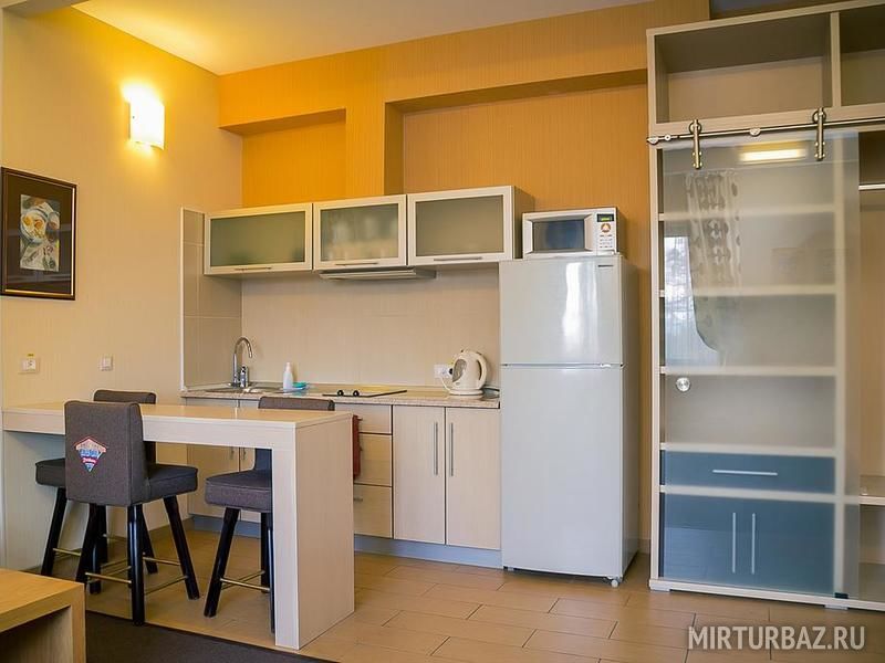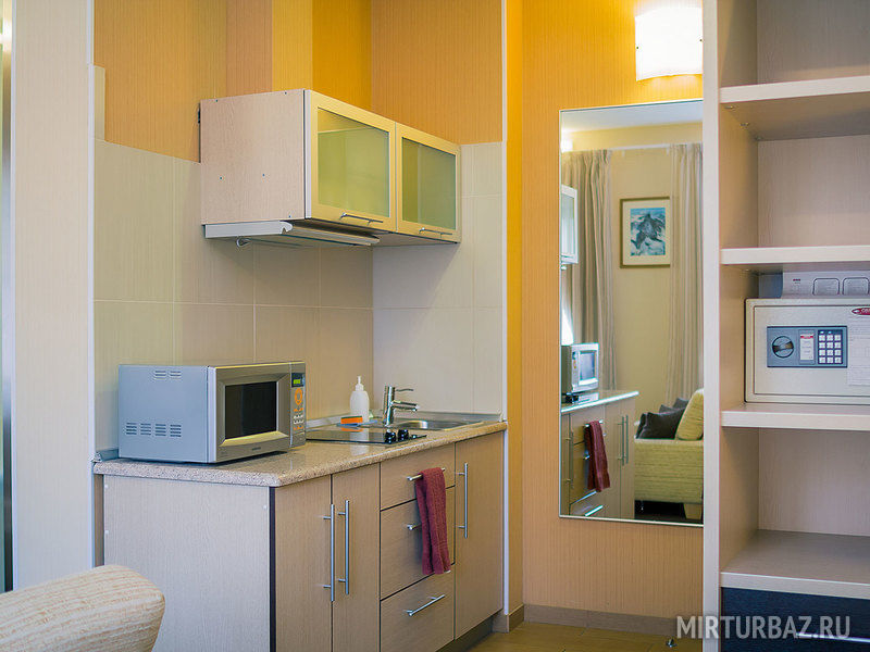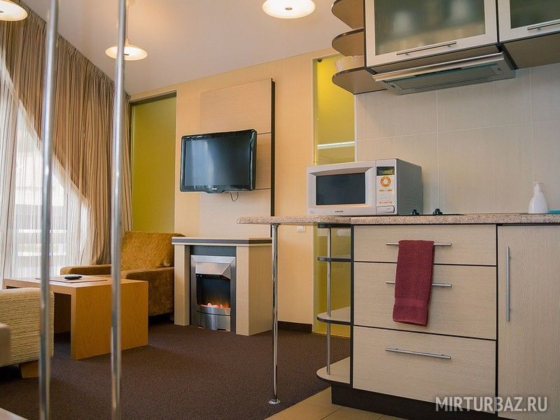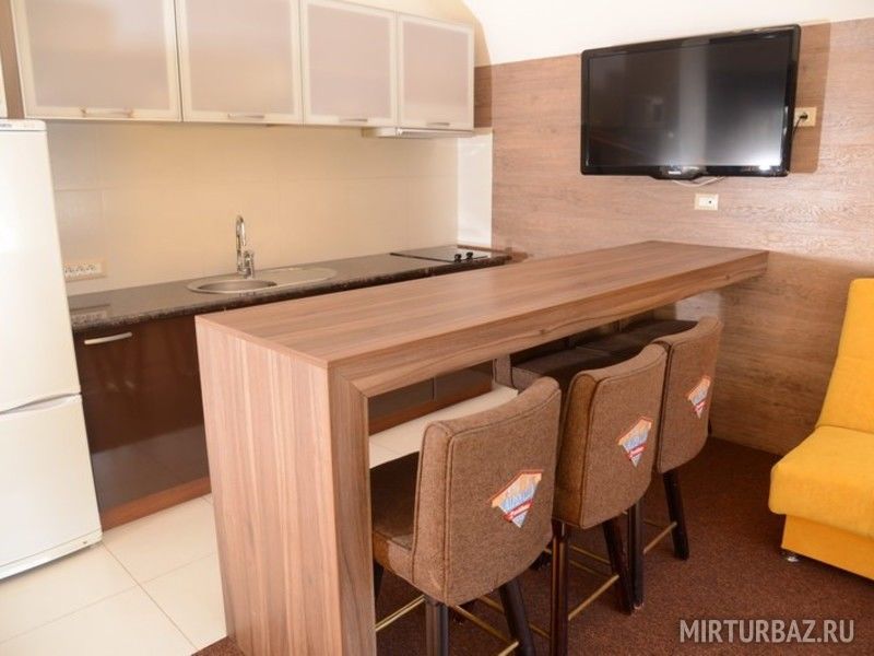 Все номера этого типа включают в себя: обеденную зону с полностью оборудованной кухней (варочная панель , 2-камерный холодильник, СВЧ-печь, набор посуды), обеденный стол, телевизор, телефон, сейф. Комнаты (изолированные и проходные) с односпальными кроватями.