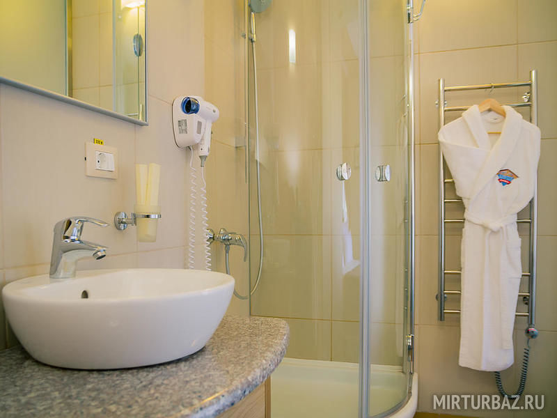 Ванная комната: фен, душевая кабина, косметика, халаты, тапочки.
