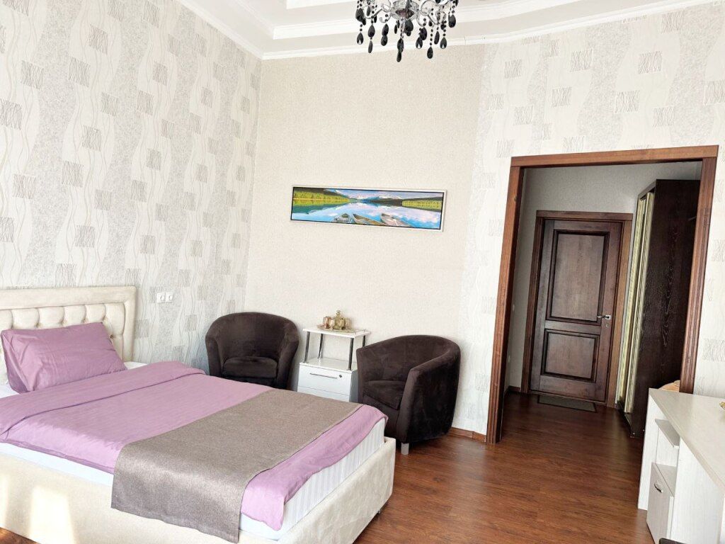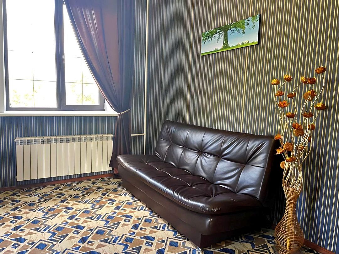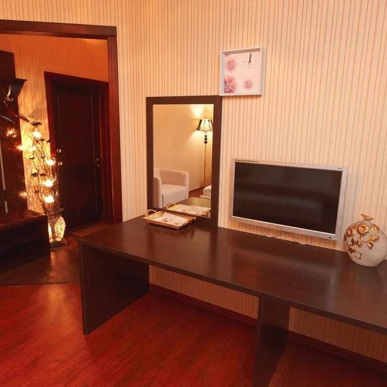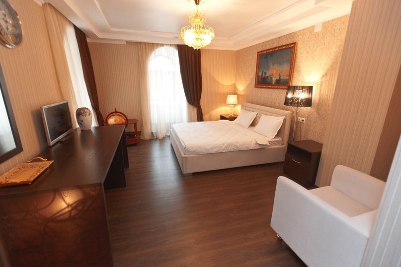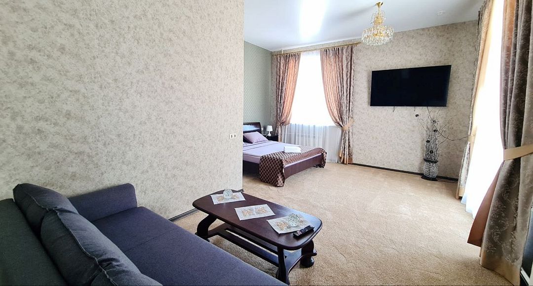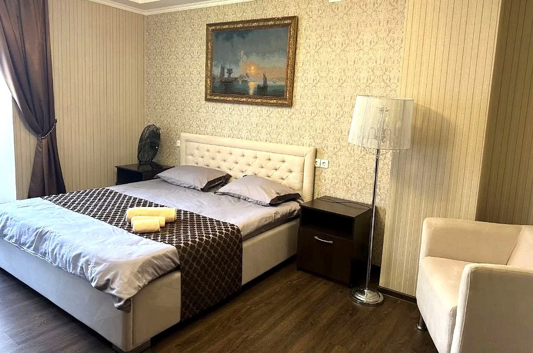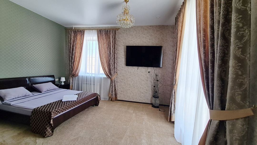 Представляем Вам просторный и комфортабельный "Люкс", удачно сочетает стильный дизайн и домашний уют, что позволяет гостям насладиться пребыванием в нашем гостевом доме. В гостевой комнате :двуспальная кровать (180 х 200 см.) с матраcом «Askona», Wi-Fi, звукоизоляция, шторы «Blackout», ванная комната с косметическими средствами, халатами, феном и тапочками, LCD телевизор. БЕСПЛАТНО: - парковка - чай и кофеУслуги и удобства