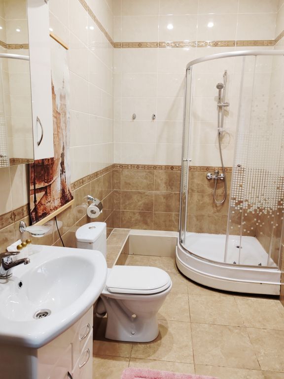 кровать King size, ТВ, шкаф-купе, тумба, фен, тапочки, гигиенические принадлежности, с/у с душем.