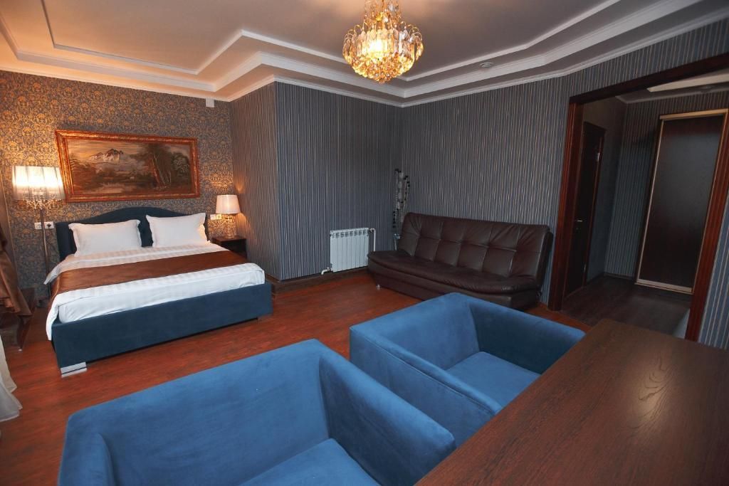 кровать King size, мини-холодильник, чайная станция, раскладной диван, ТВ, шкаф-купе, кресла, кондиционер, фен, тапочки, халаты, гигиенические принадлежности, с/у с душем.