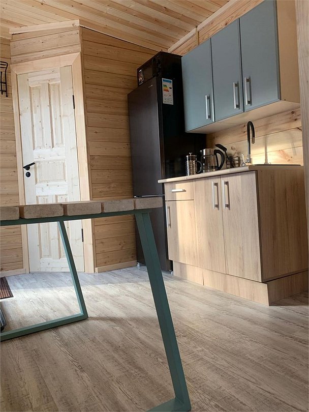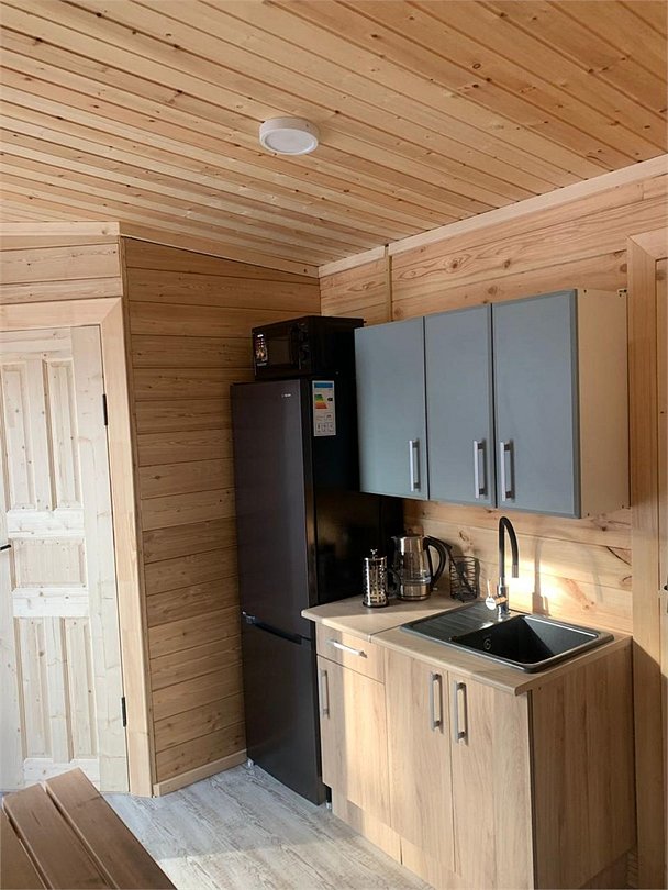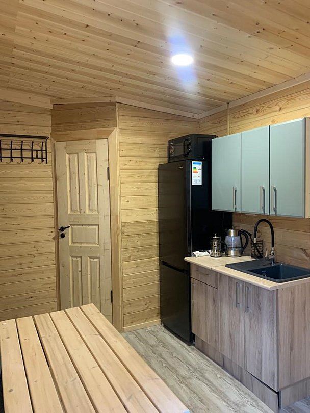 Отдельно стоящий домик 5. Вместимостью от2х до 4-х гостей, 2 основных и 2-х дополнительных места (раскладной диван). Имеется зона кухни: варочная панель, микроволновая печь, электрический чайник, набор необходимой посуды. зона гостиной: телевизор, диван, шкаф для одежды. Санузел: душ, раковина, унитаз, зеркало. Теплый пол. Сушилка профессиональная для обуви.Услуги и удобства