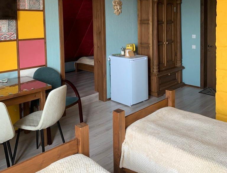 4 односпальные кровати, ТВ, холодильник, чайник, посуда, фен, халаты, с/у с душем.