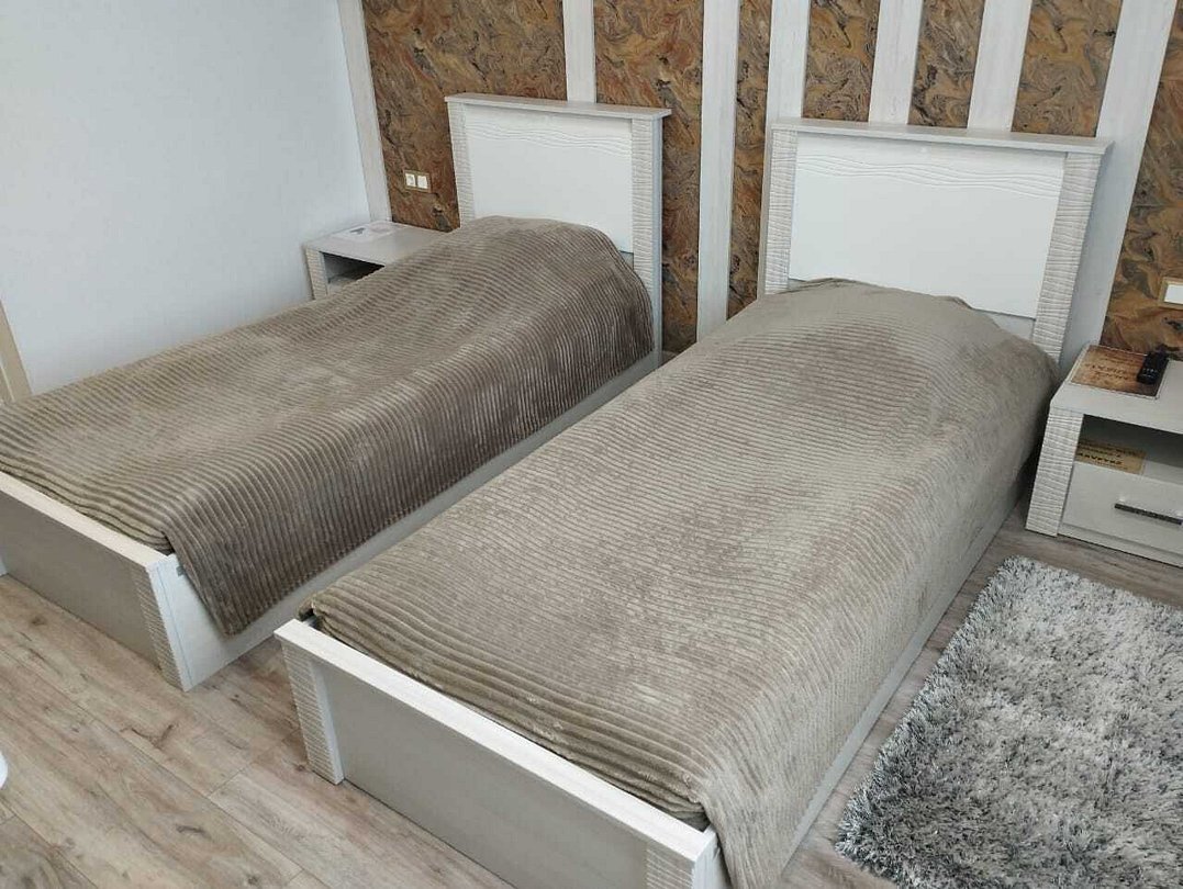 2 односпальные кровати, ТВ, холодильник, чайник, посуда, халаты, фен, с/у с душем.