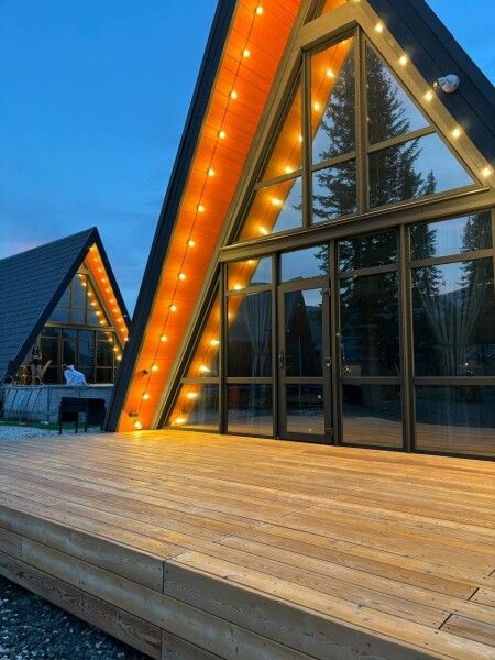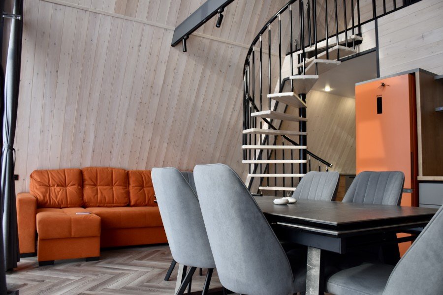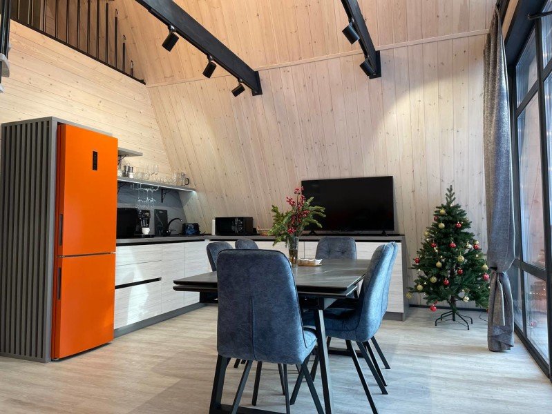 Вам будут доступны уютные современные шале с большими панорамными окнами, высокими потолками, скоростным Wi-Fi и собственными террасами с мангалом.