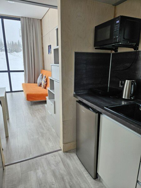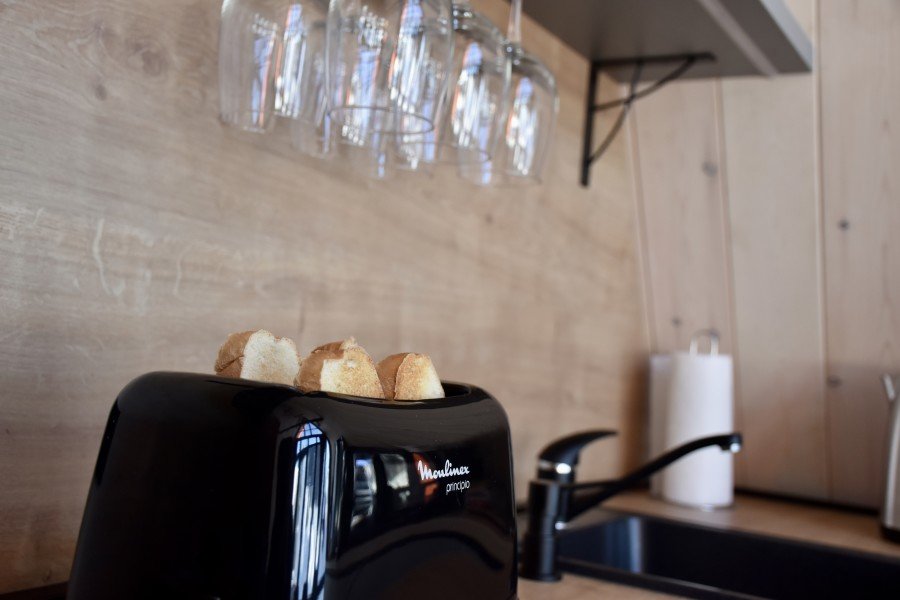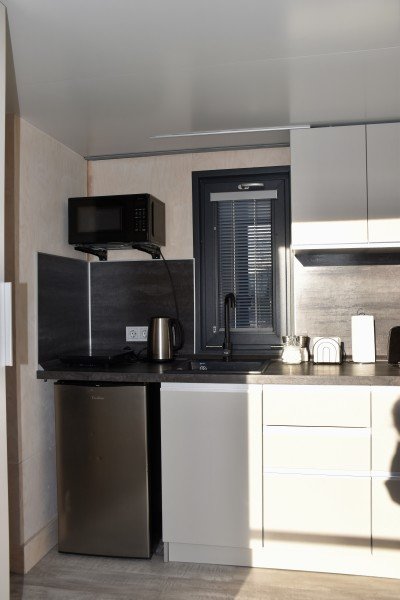 - кухонный уголок: есть вся необходимая посуда и техника (чайник, гейзерная кофеварка, тостер, электрическая плита, микроволновая печь, холодильник);