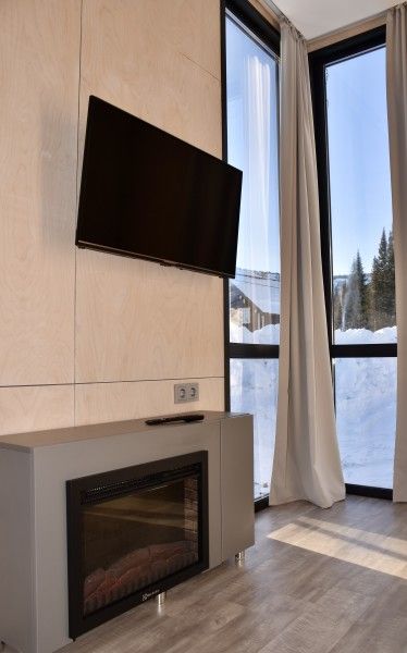 Из всех домов прекрасный вид на снежные склоны и хвойные деревья.