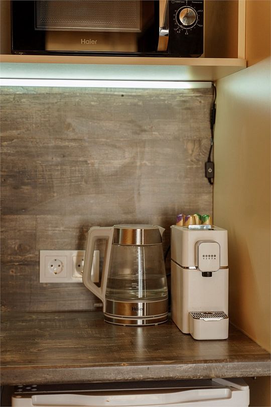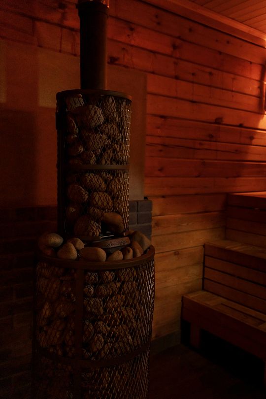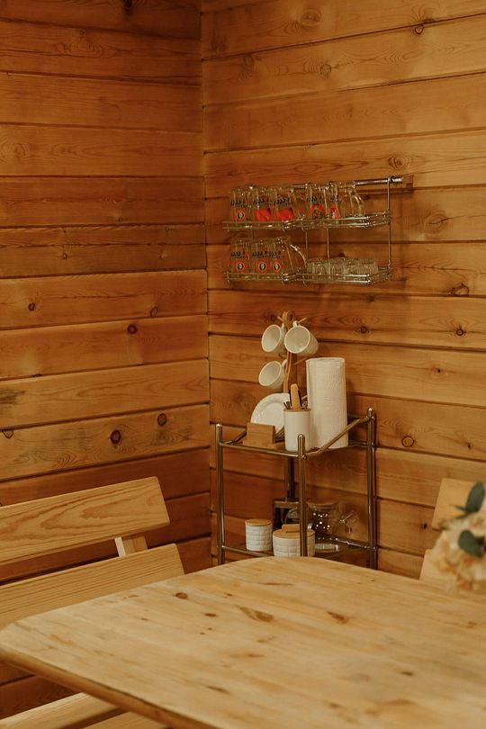 Внутри расположено сердце бани — парная с русской дровяной печью. Просторная комната отдыха с камином и с чайной зоной: большой стол на 8 персон, чайник, таёжный чай и цветочный мед.