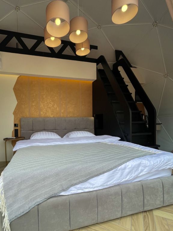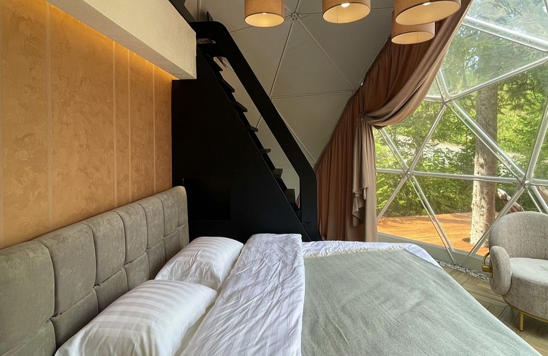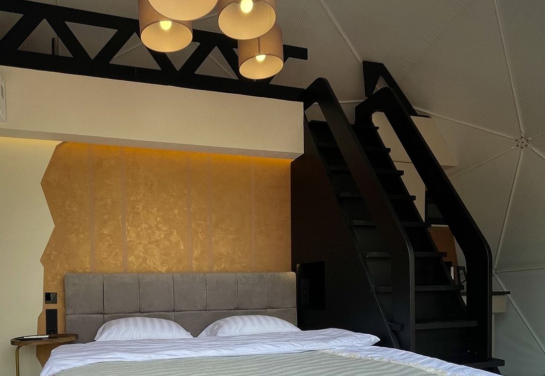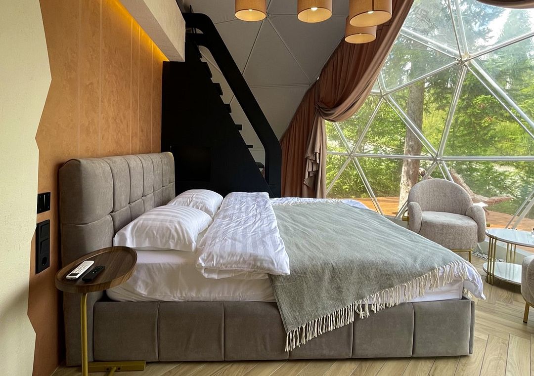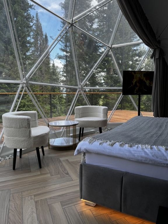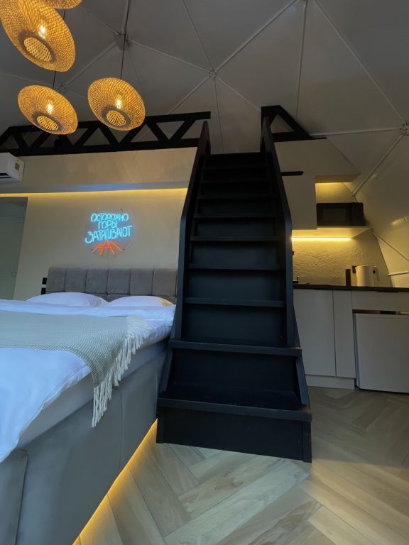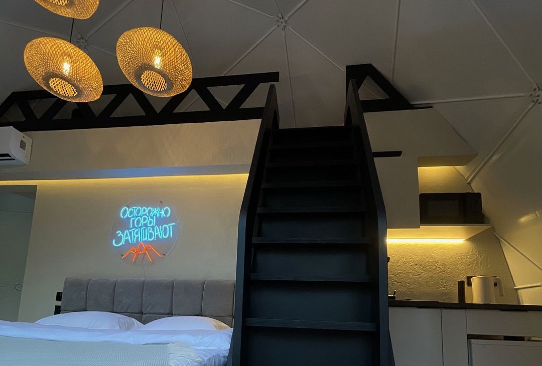 Отель, включающий в себя несколько уютных купольных домов, разместился всего в 5 минутах езды от горнолыжных подъемников. Комплекс находится вдали от городской суеты, среди живописной сибирской природы, поэтому отлично подойдет для отдыха и релакса в окружении леса и гор. Каждый купольный дом – это сочетание современного стиля и природной эстетики. В домах предусмотрено все, что нужно для проживания – теплый пол, кондиционер, удобные двуспальные кровати на первом и втором ярусе, оборудованная мини-кухня с посудой и плитой, персональный санузел с душевой кабиной. Перед каждым домом организована уютная терраса с креслами и гриль-зоной.