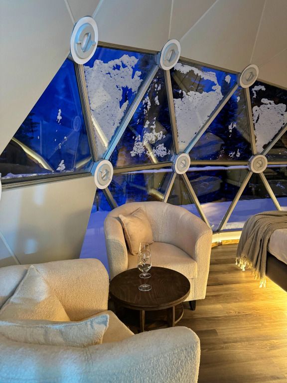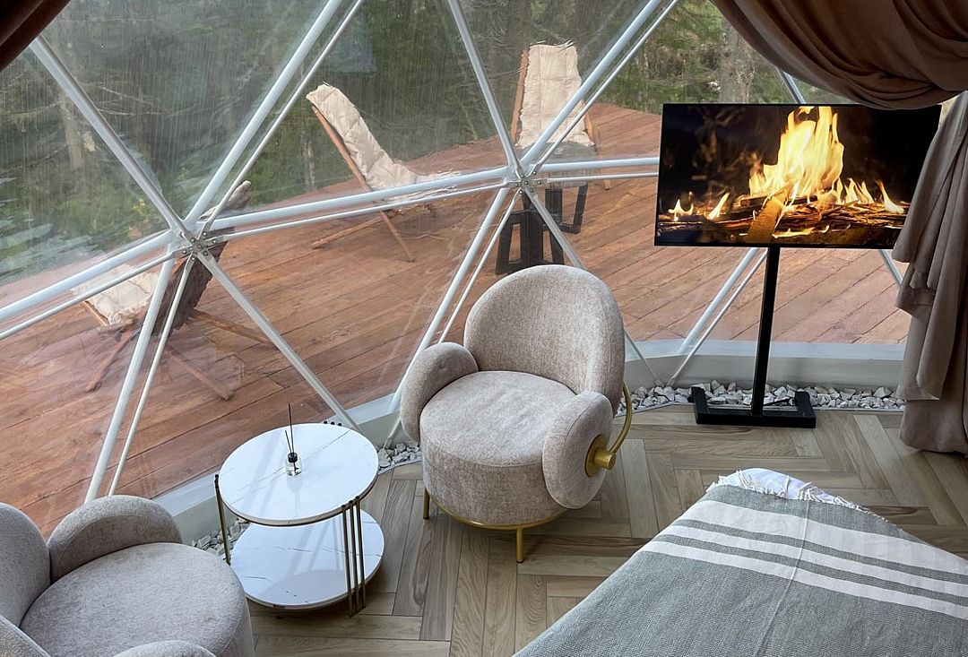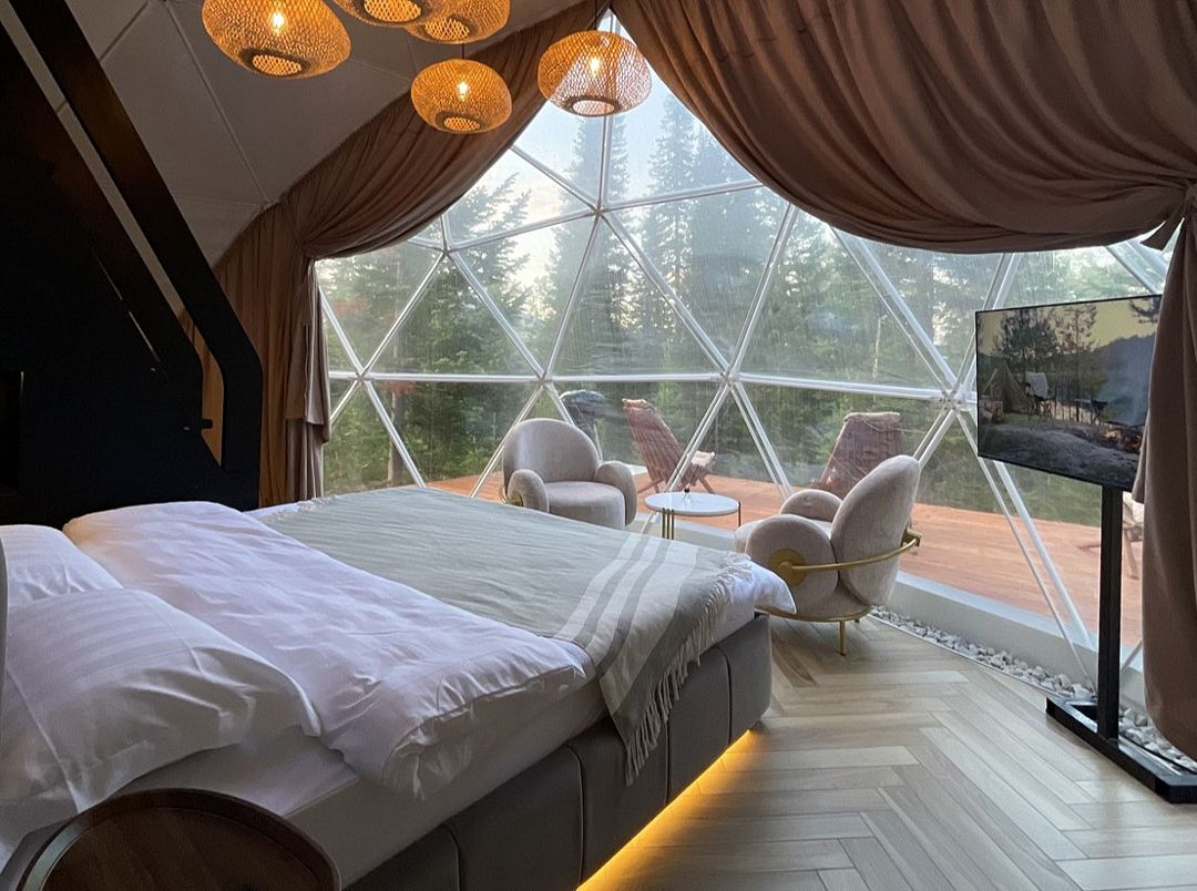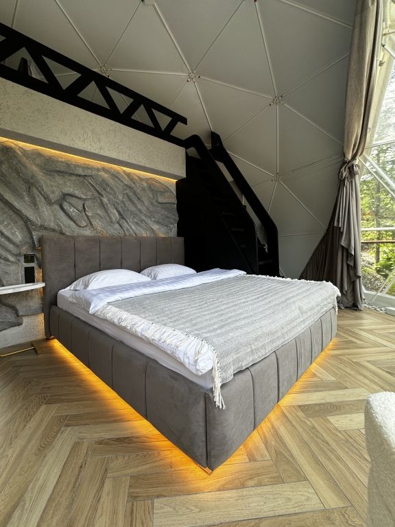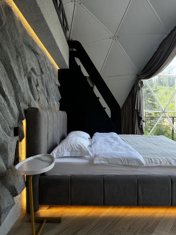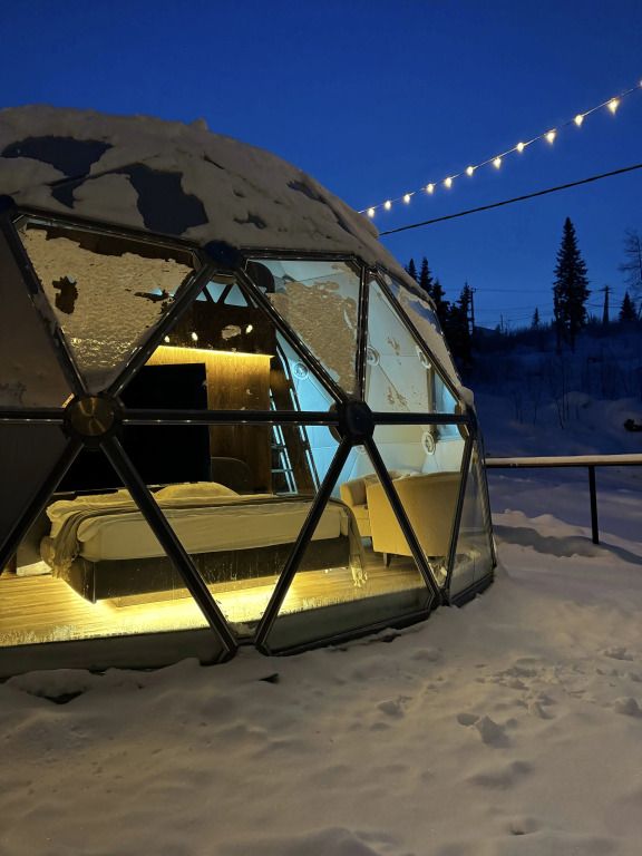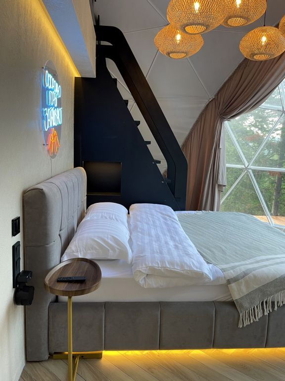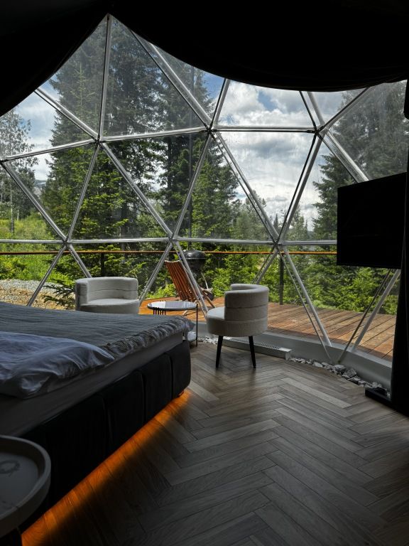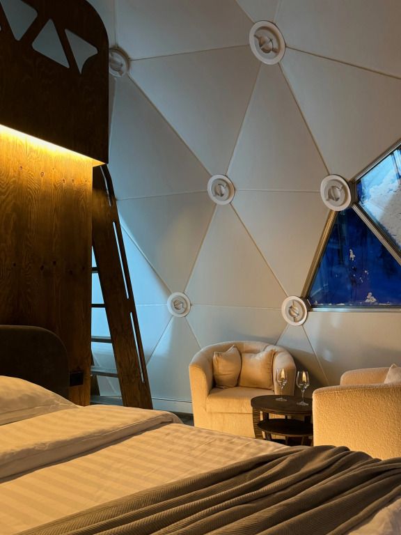 Отель, включающий в себя несколько уютных купольных домов, разместился всего в 5 минутах езды от горнолыжных подъемников. Комплекс находится вдали от городской суеты, среди живописной сибирской природы, поэтому отлично подойдет для отдыха и релакса в окружении леса и гор. Каждый купольный дом – это сочетание современного стиля и природной эстетики. В домах предусмотрено все, что нужно для проживания – теплый пол, кондиционер, удобные двуспальные кровати на первом и втором ярусе, оборудованная мини-кухня с посудой и плитой, персональный санузел с душевой кабиной. Перед каждым домом организована уютная терраса с креслами и гриль-зоной.