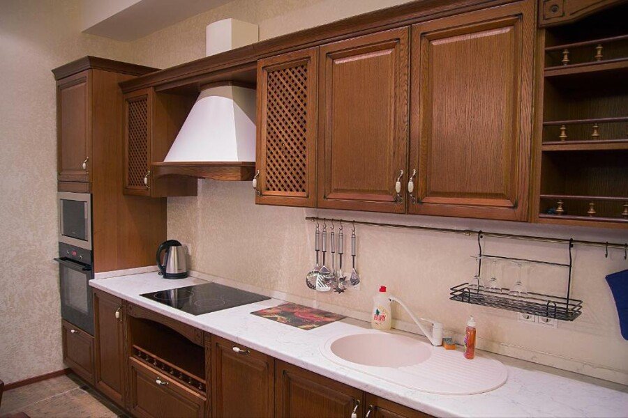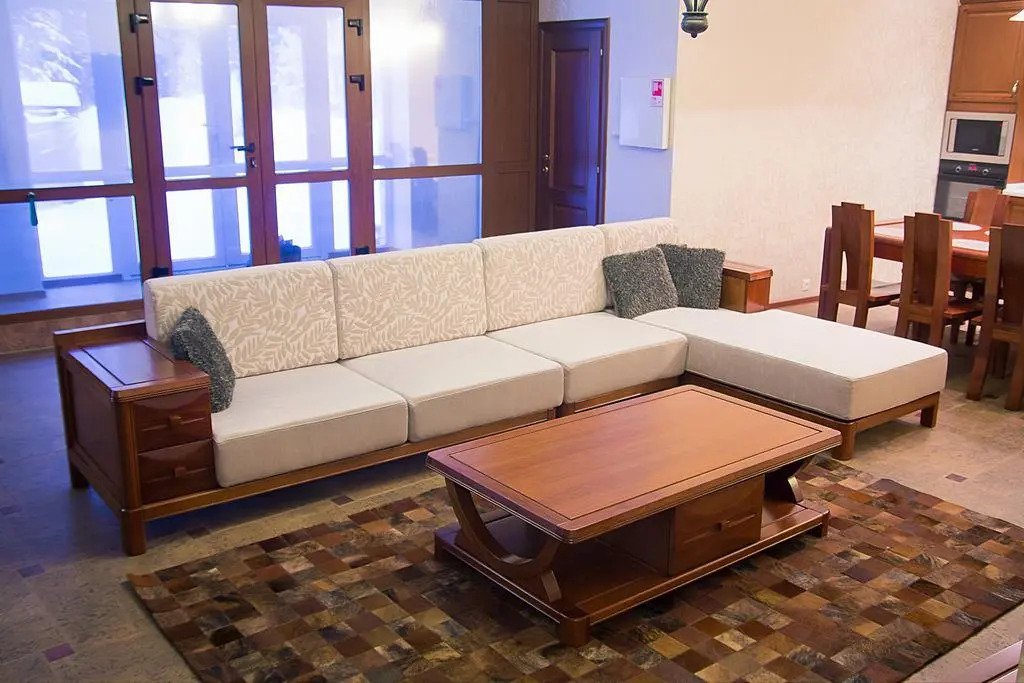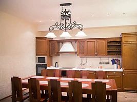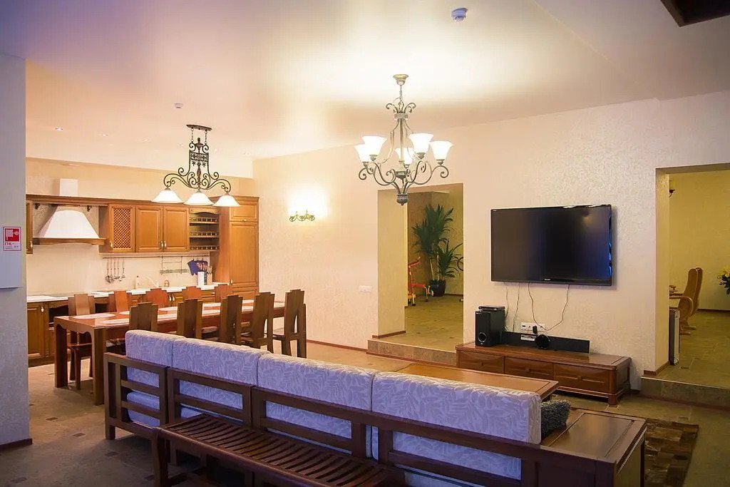 В резиденции собственная кухня (мойка, СВЧ печь, холодильник, электроплита, набор посуды) с обеденной зоной на 10 человек. В зоне отдыха два дивана, 3D телевизор, игровая приставка, кедровая сауна.