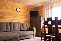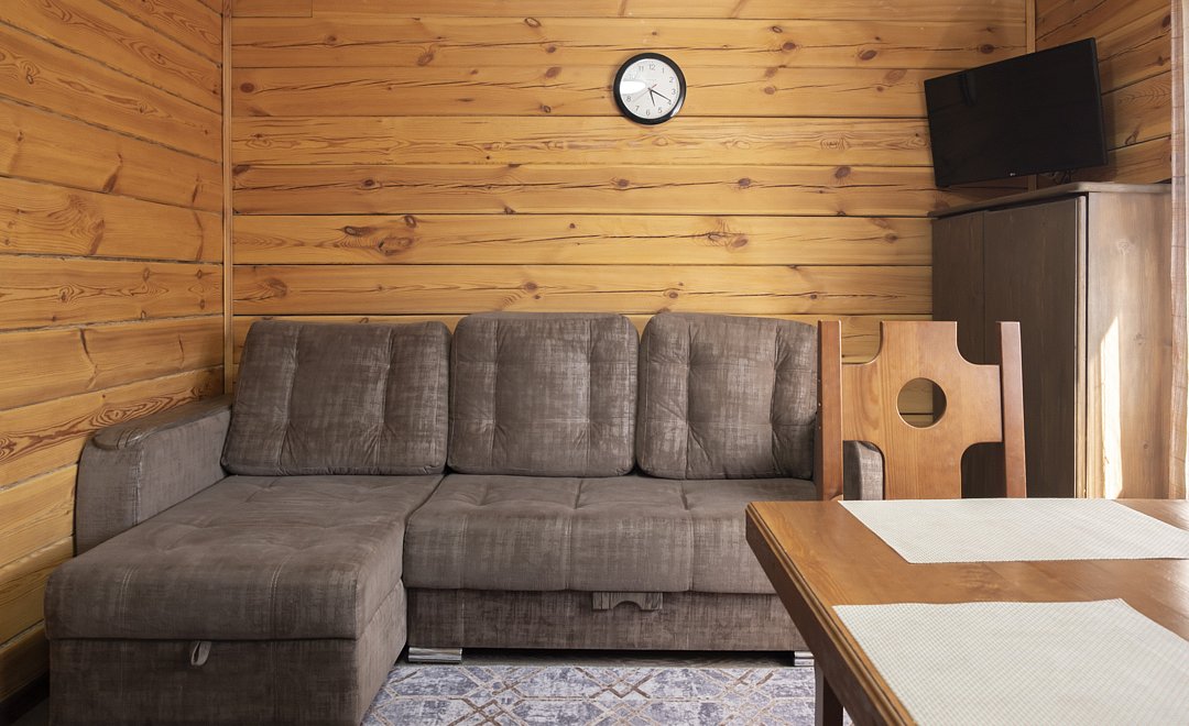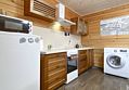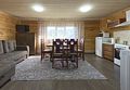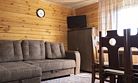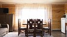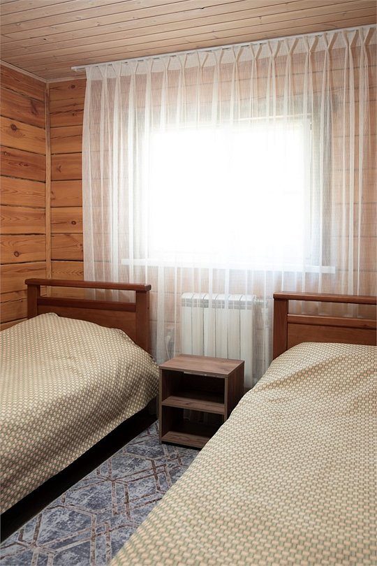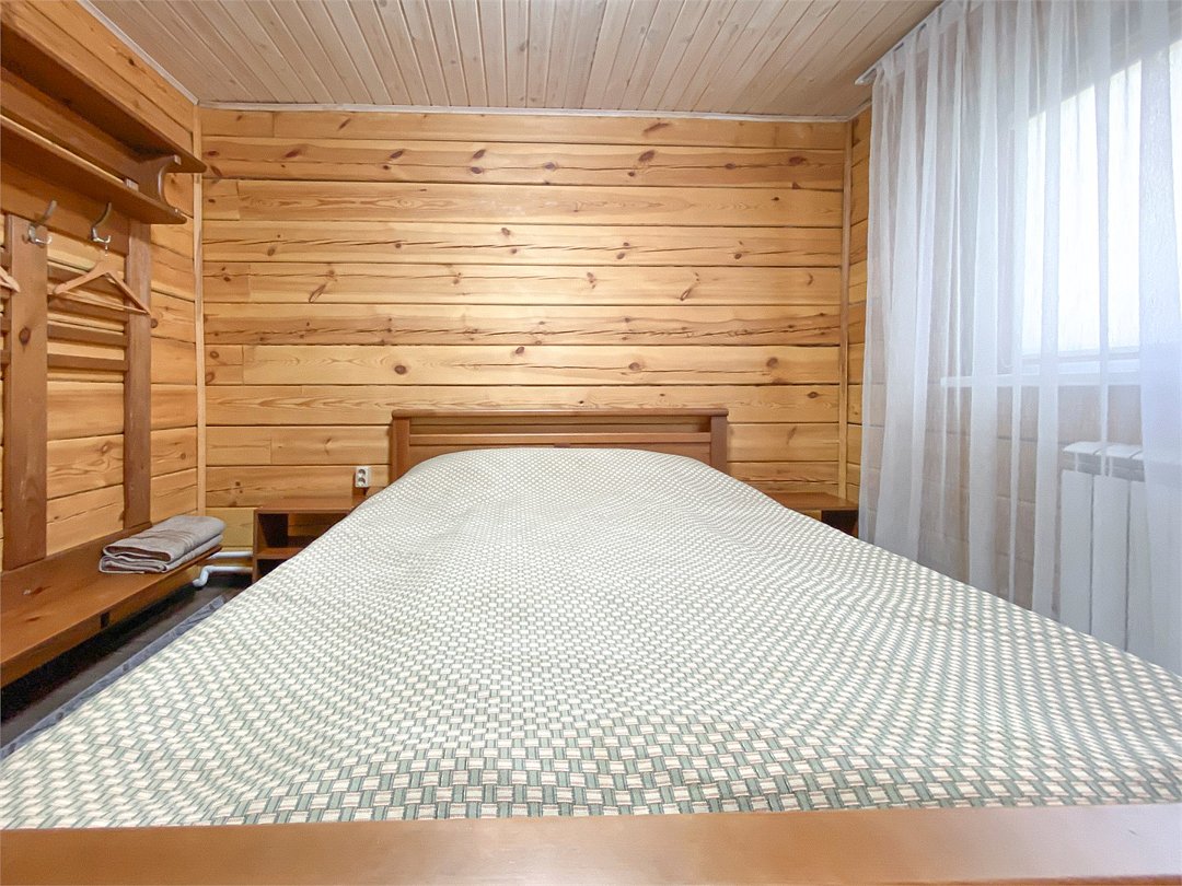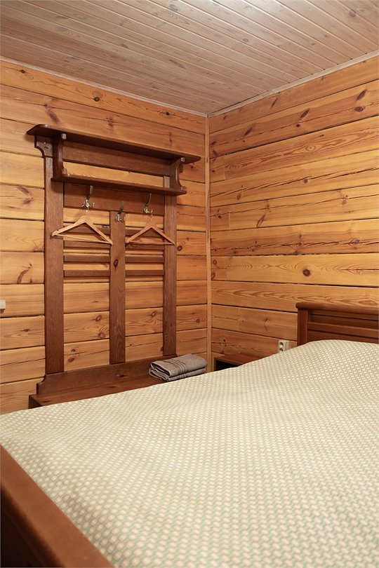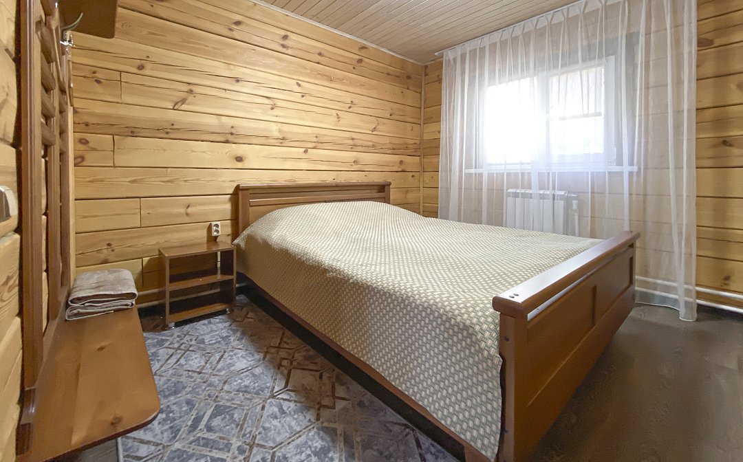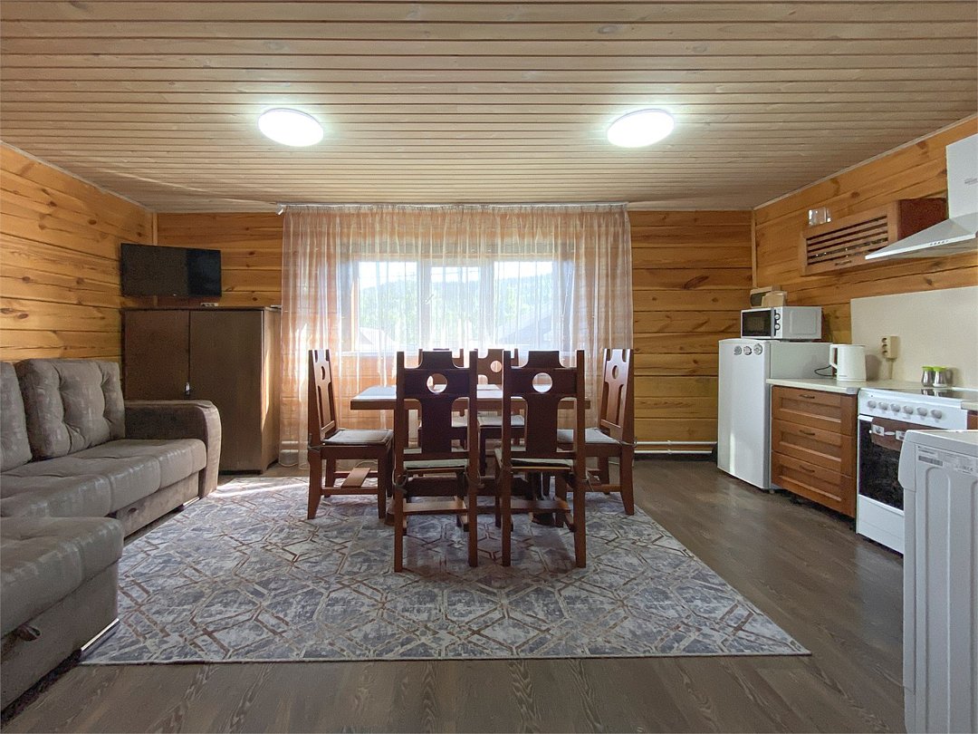 Одноэтажный дом из натурального дерева для проживания шести гостей. В доме две спальни, один санузел и большая гостиная, совмещенная с кухней. Спальни рассчитаны на проживание 4-х гостей, в комнатах одна двуспальная и две односпальные кровати. В гостиной расположен диван, большой стол, телевизор. Кухня оборудована плитой, холодильником, микроволновой печью, стиральной машиной, чайником, набором посуды на шесть персон. Оснащение санузла: душевая кабина, фен, косметический набор, полотенце. В доме есть теплый пол, сушилка для горнолыжного оборудования. Рядом с домом находится зона барбекю с крытой беседкой.Услуги и удобства